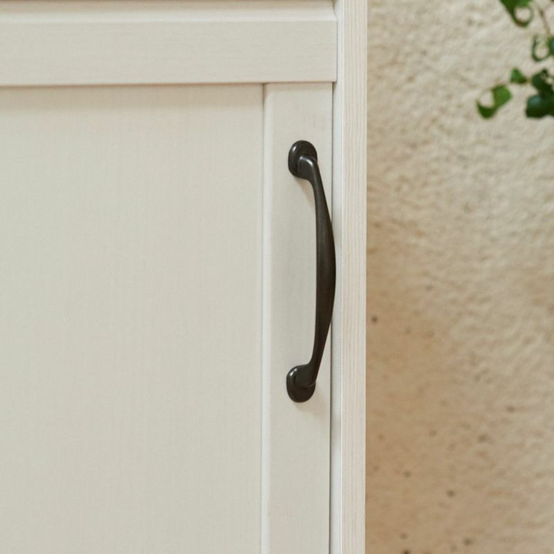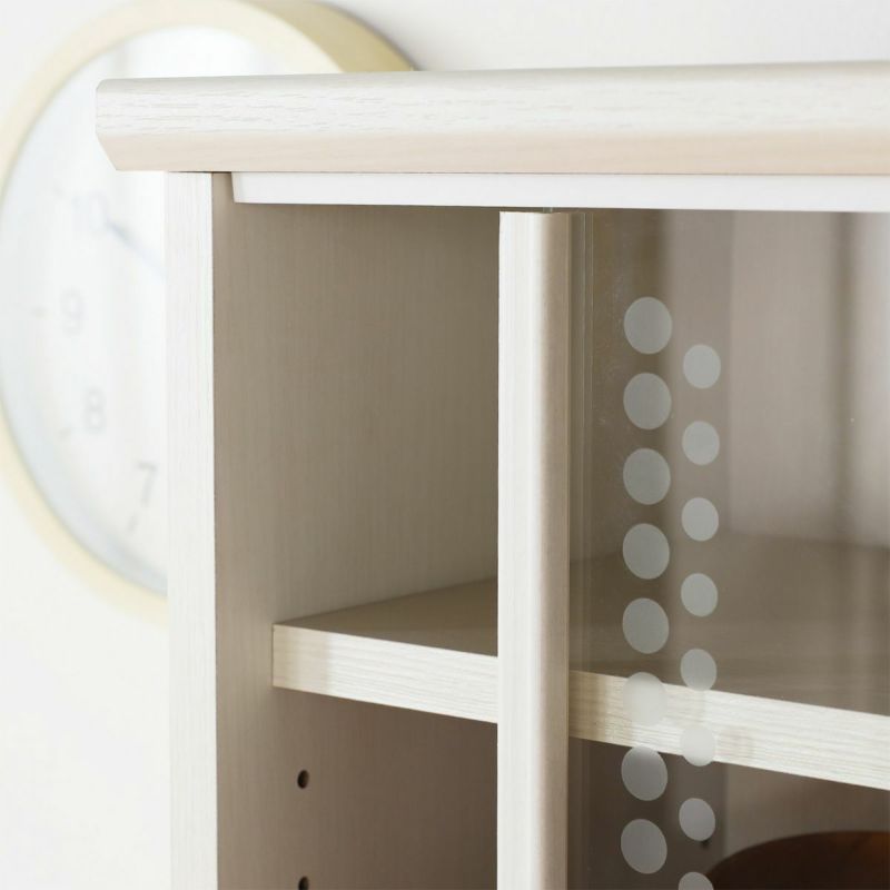 ガラスの引き戸にかわいいドット柄のシルク印刷。ぬくもりと遊び心を加えました。薄いオーク柄の木目シート。オフホワイト色はお部屋に馴染みやすいカラーです。マットな黒色とかたちがレトロ風。ぬくもりを感じるデザインです。ガラス扉と板扉があるので清潔を保ちたいキッチン周りの収納に便利です。2枚の棚板は可動式。収納物のサイズに合わせて高さを調節できます。別売りのCEN-3055Gを上に重ねて使用出来ます。(連結用の木ダボはCEN-3055Gに付属。)