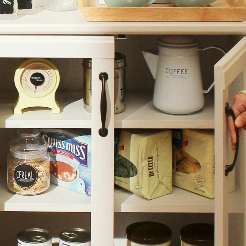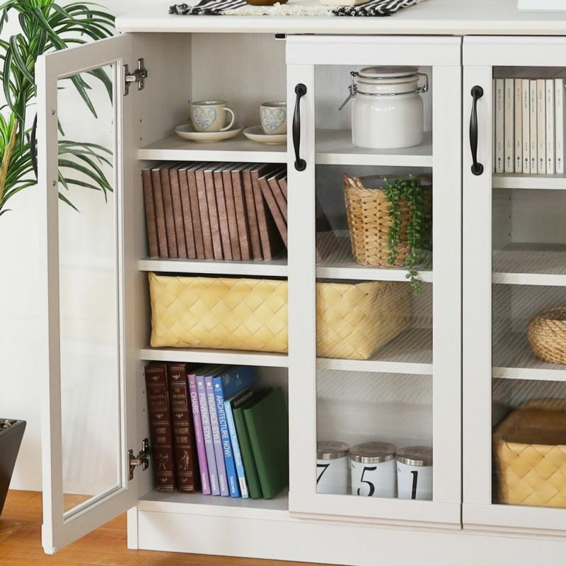クリアな両開きのガラス扉。しまってある物が確認できます。薄いオーク柄の木目シート。オフホワイト色はお部屋に馴染みやすいカラーです。扉があるので清潔を保ちたいキッチン周りの収納に便利です。