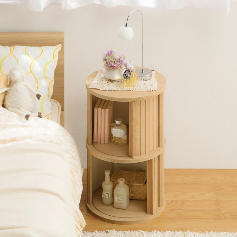小物を置いたり、収納したり、ベッドの横で便利に使えます。かわいらしくて新しい円柱フォルムのラック。様々なつかい方を楽しめます。円にそって開く扉の動きがユニークです。