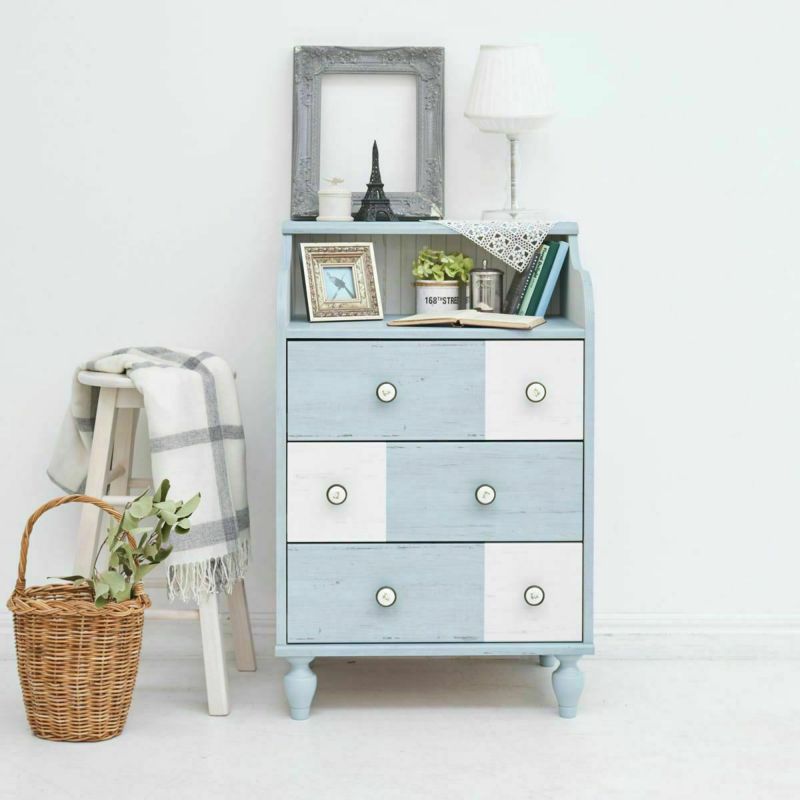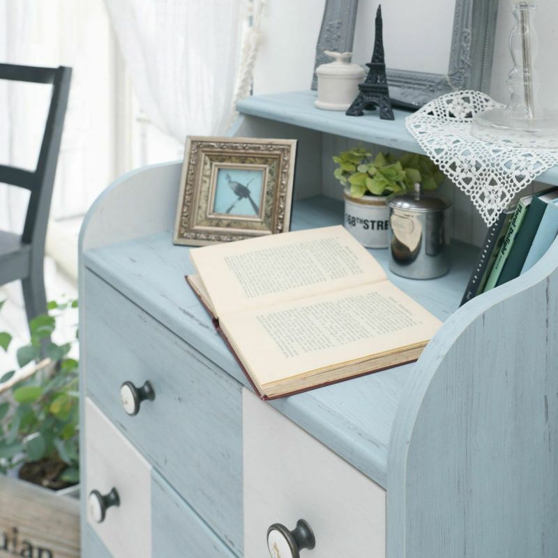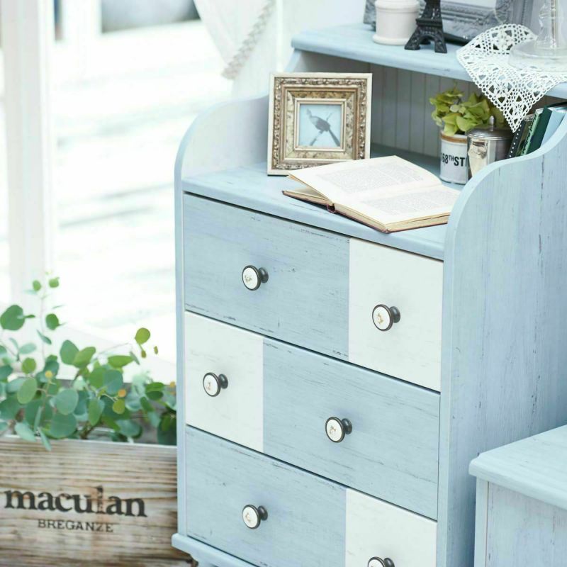 スクエアにデザインされた引き出し。甘すぎないライトブルーとホワイトのコントラストが美しく、お部屋のアクセントになります。引き出しの上はオープンスペース。お気に入りの物を飾ったり、よく使うものをちょい置きしたりできます。取っ手はアンティーク加工のデザイン。細部にこだわってフレンチテイストを表現しています。金属レールを使った引き出しは滑らかな開閉。耐久性にも優れています。シルエットが美しい脚部でエレガントさが際立ちます。
