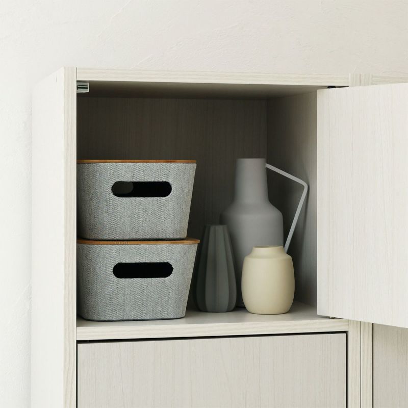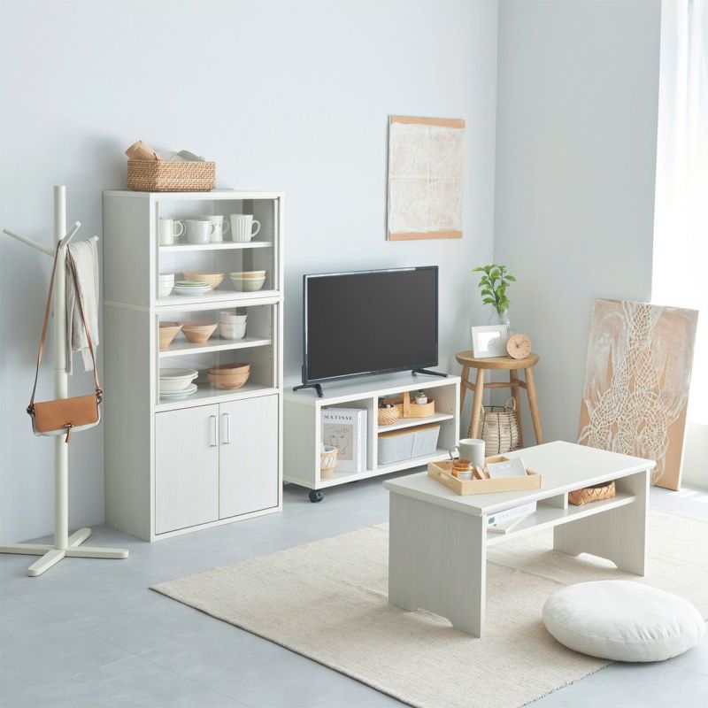 中棚の内寸奥行は34.2cm。本やストック品、タオルなどの収納に便利です。シンプルでつかみやすい取っ手。シルバーが清潔でスタイリッシュな印象を与えます。フルニコはリビングやキッチン収納も充実。シリーズで揃えて統一感のある収納スペースをつくることができます。家具と壁を固定して、地震などでの前倒れをしにくくする免震補助バンドが付属しています。