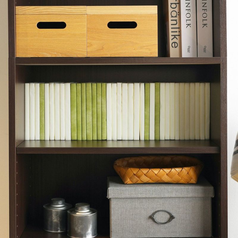 棚1段の内寸幅は54.5cm。コミックを約36冊収納できるサイズです。棚の内寸奥行26.4cmで、文庫本やコミック(新書判)を前後に並べて収納できます。