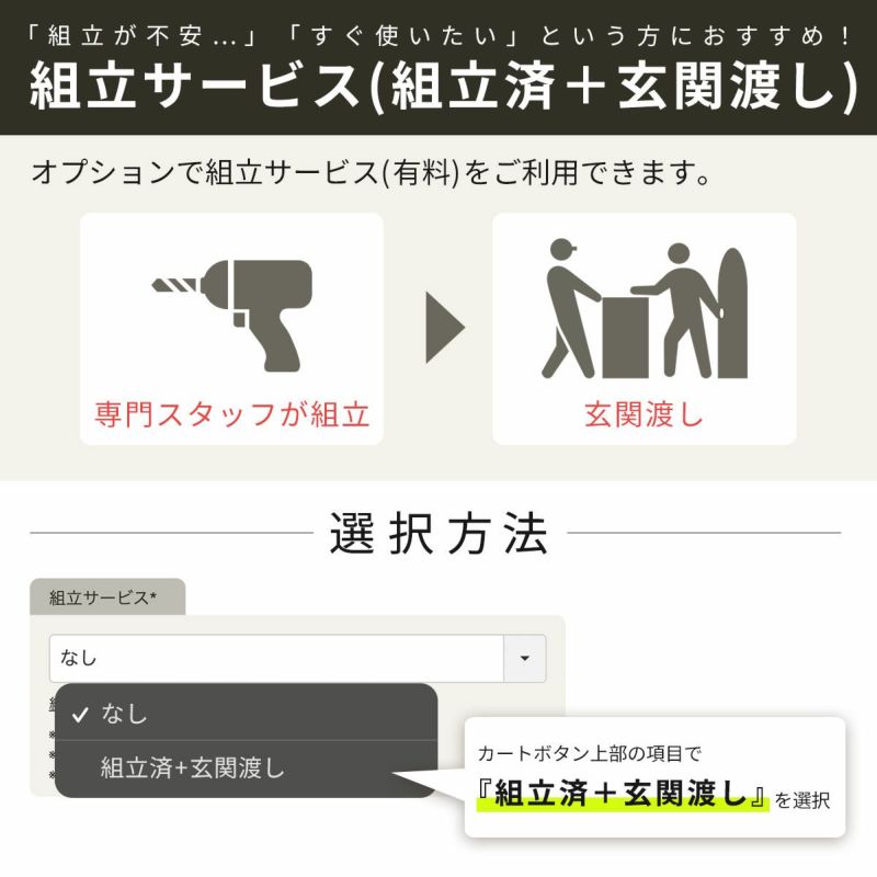 天板の下には中棚付き。本や雑誌、ノートPCやリビング小物の収納に便利です。フルニコはリビングやキッチン収納も充実。シリーズで揃えて統一感のある収納スペースをつくることができます。オプションで組立サービス(有料)が選択できます。専門スタッフが組み立てた、組立済みの商品を玄関までお届けします。