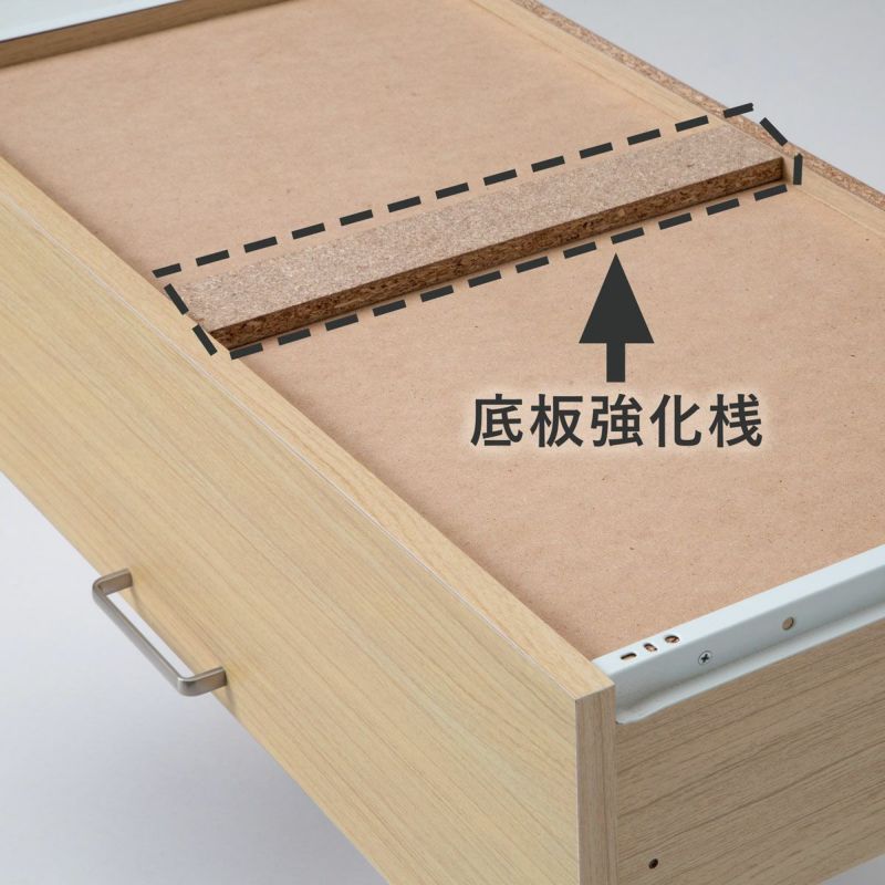 4段の引き出しで衣類や小物をたくさん収納できます。上から1段目は深さ9.6cm、2段目~4段目は深さ12.6cmの2サイズの引出。収納物に合わせてスペースの無駄なく収納できます。底板に補強桟を設けているから、服などをたくさん収納しても安心して使えます。