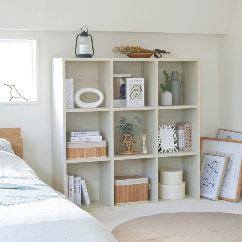 どんな使い方でも美しく、部屋で存在感を放つラックを目指してデザインしました。棚1マスは幅も高さも38.2cmの正方形。お部屋の空間もきれいに整った印象になります。天地板・中棚・側板のすべての板が同じ厚さで統一されているので、より整った印象を与えて正方形の美しさを際立たせます。自然の素材感が表現された、やさしい印象を与える木目調がデザインされてます。背板は本体と同色の木目柄か白単色のどちらかを組立時に選べます。木目柄はより重厚な印象、白単色は抜け感が出て明るい印象になります。