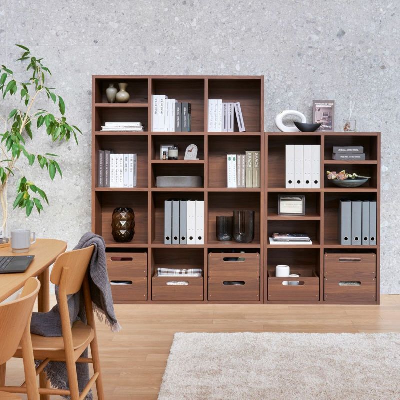 どんな使い方でも美しく、部屋で存在感を放つラックを目指してデザインしました。棚1マスは幅も高さも38.2cmの正方形。お部屋の空間もきれいに整った印象になります。天地板・中棚・側板のすべての板が同じ厚さで統一されているので、より整った印象を与えて正方形の美しさを際立たせます。