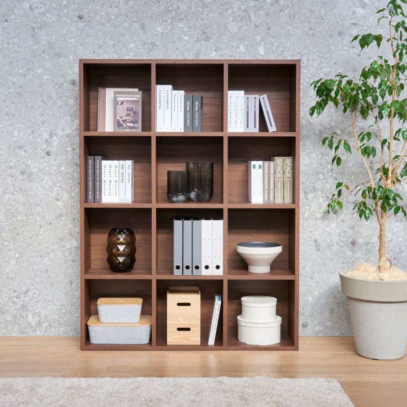 どんな使い方でも美しく、部屋で存在感を放つラックを目指してデザインしました。棚1マスは幅も高さも38.2cmの正方形。お部屋の空間もきれいに整った印象になります。天地板・中棚・側板のすべての板が同じ厚さで統一されているので、より整った印象を与えて正方形の美しさを際立たせます。