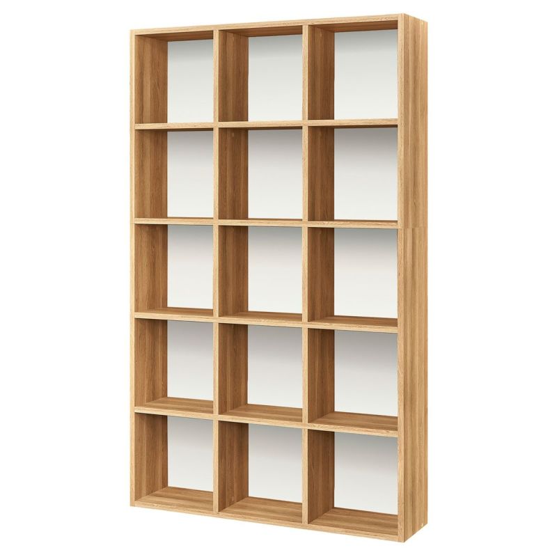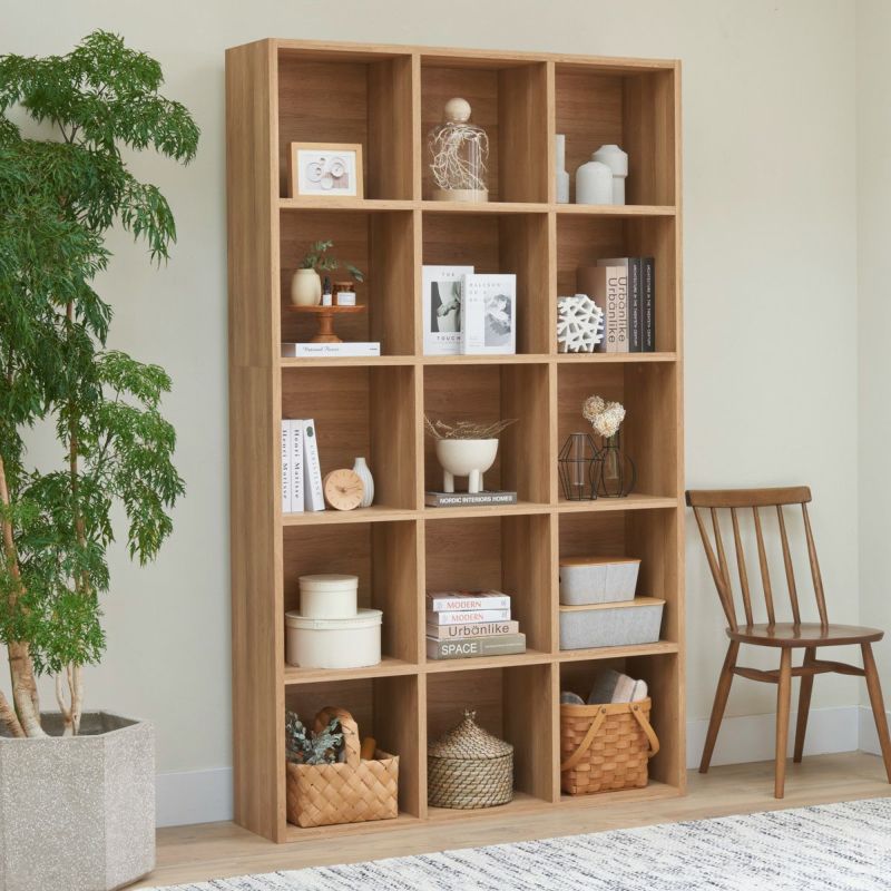 どんな使い方でも美しく、部屋で存在感を放つラックを目指してデザインされた本棚です。天地板・中棚・側板のすべての板が同じ厚さで統一されているので、より整った印象を与えて正方形の美しさを際立たせます。背板は本体と同色の木目柄か白単色のどちらかを組立時に選べます。幅124cmのナチュラルブラウンです。