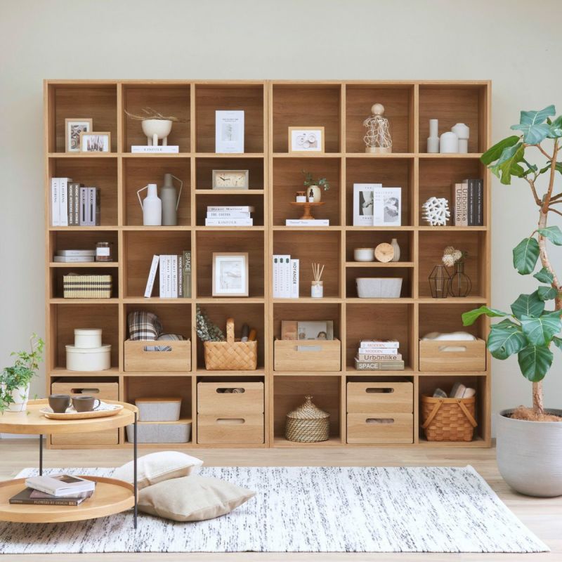 どんな使い方でも美しく、部屋で存在感を放つラックを目指してデザインされた本棚です。天地板・中棚・側板のすべての板が同じ厚さで統一されているので、より整った印象を与えて正方形の美しさを際立たせます。背板は本体と同色の木目柄か白単色のどちらかを組立時に選べます。幅84cmのナチュラルブラウンです。