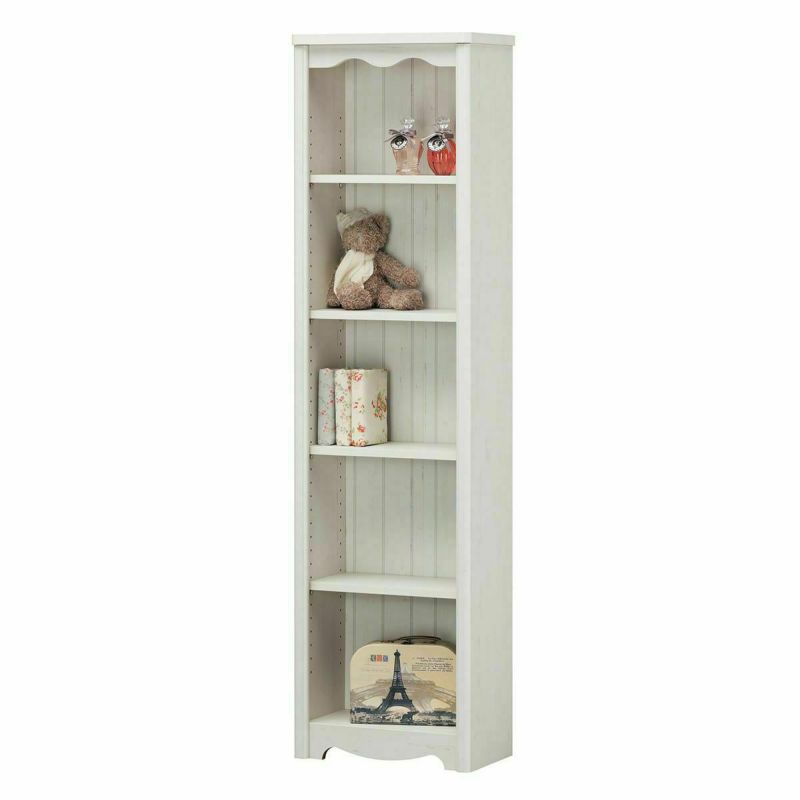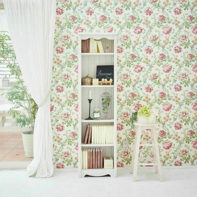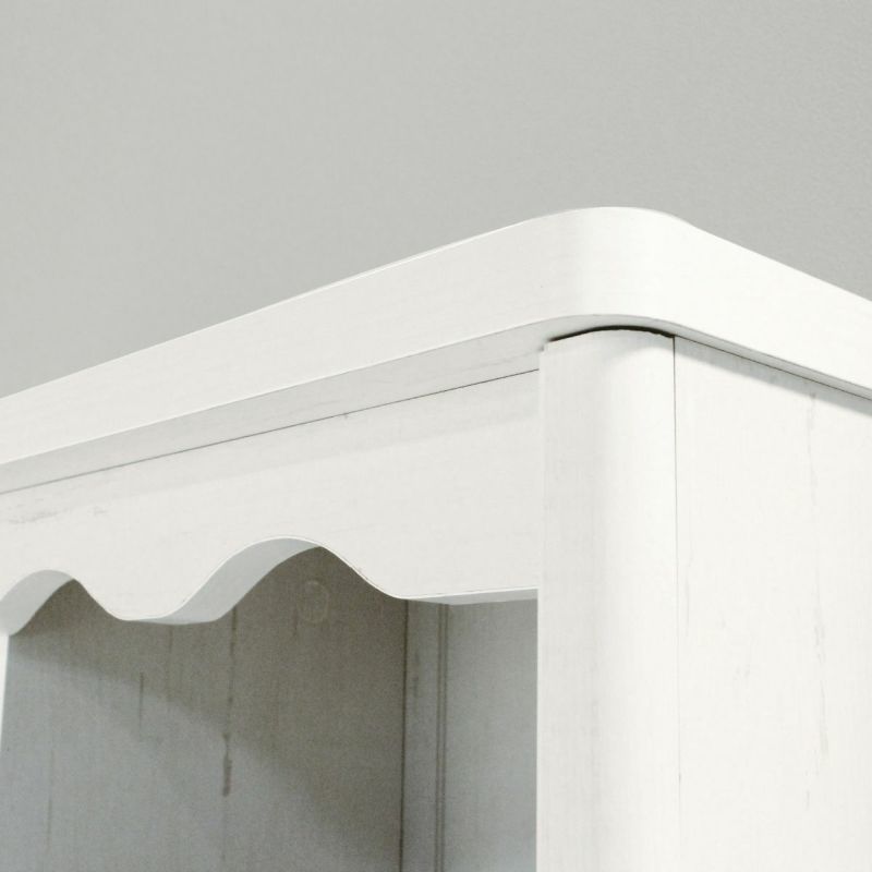 天板飾りのやわらかな曲線がエレガントな雰囲気を演出します。シャビー感のあるホワイト塗装のシートと、ピーリング加工風ストライプ柄の背板がアクセントになっています。本体の広がりを抑える機能を強化したオリジナルの棚受け金具を使用することで、すべての棚をお好みの位置に移動できます。
