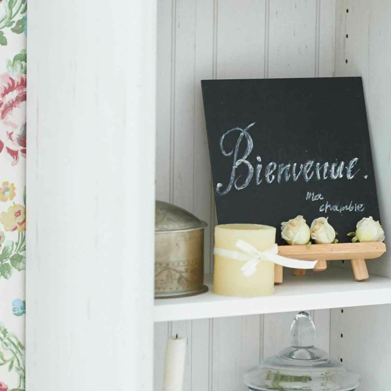 天板飾りのやわらかな曲線がエレガントな雰囲気を演出します。シャビー感のあるホワイト塗装のシートと、ピーリング加工風ストライプ柄の背板がアクセントになっています。