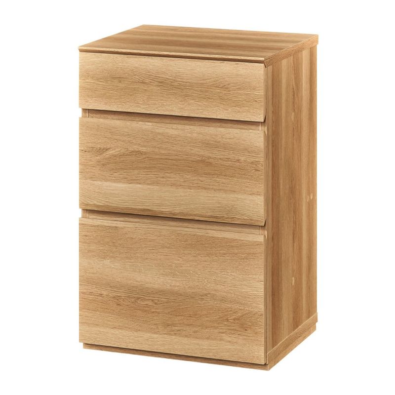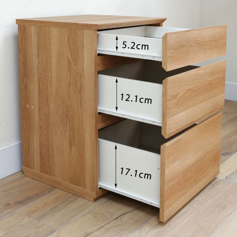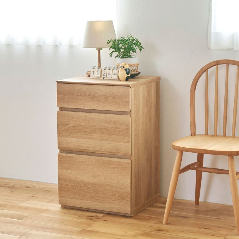 豊富なラインナップでリビングの家具を揃えられるコーディネート家具。買い足しのときもナチュリカシリーズで揃えることで、統一感のあるインテリアを保つことができます。複数を横に並べるときは、商品同士をネジでしっかり固定できるから安心です。深さの違う3杯の引き出しで、細かい文房具から書類まで様々なサイズのリビング雑貨を収納できます。一番下の引き出しは奥行32.9cm、深さ22.0cm。A4サイズを横にして収納することができます。天板が背面に少し出ているので、背板と壁の間に隙間ができます。配線を通したり、巾木をよけたりできる構造です。取っ手がないので、シンプルですっきりとした見た目がおしゃれな印象です。引出前板に手を掛けて開くことができます。背面も化粧されているので、部屋の間仕切りとしても使用できます。