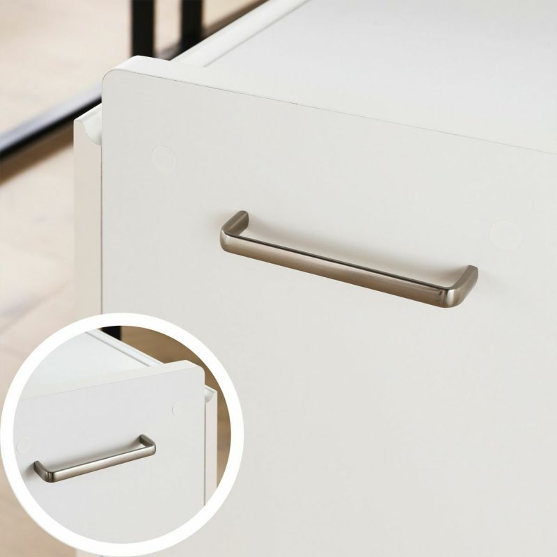 オフィスの細々としたものが後ろに落ちないように、天板の3方にこぼれ止めが付いています。取っ手は取り付け位置を左右どちらか選択できるから、置く場所によって使いやすいように取り付けができます。大切な書類や貴重品をしまっておける鍵付き扉。スペアキーが一つ付属しています。棚板は収納するものや使い勝手にあわせて、3cm間隔で高さを調節できます。本体の広がりを抑える機能を強化したオリジナルの棚受け金具を使用することで、すべての棚をお好みの位置に移動できます。前方のキャスターは、デスク下や作業時に動いてほしくないときに固定ができるストッパー付きです。背面化粧が施されているので、オフィスのどんな場所でも使えます。オプションで組立サービス(有料)が選択できます。専門スタッフが組み立てた、組立済みの商品を玄関までお届けします。