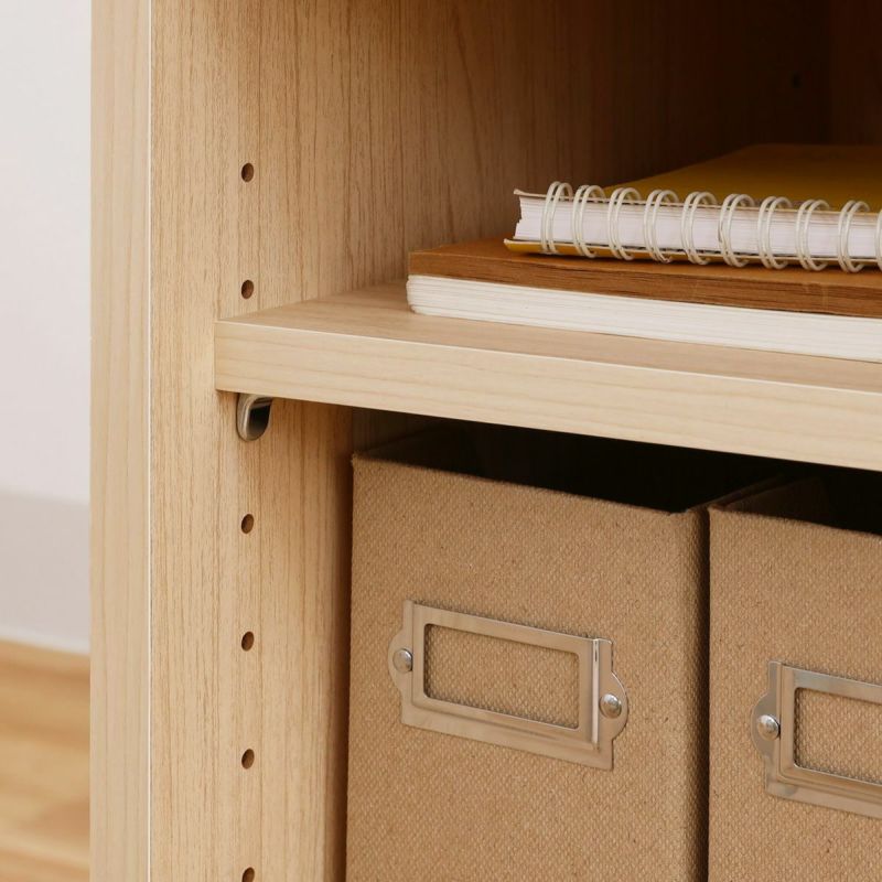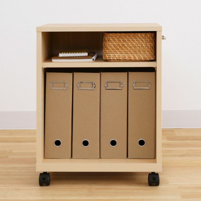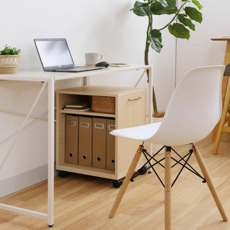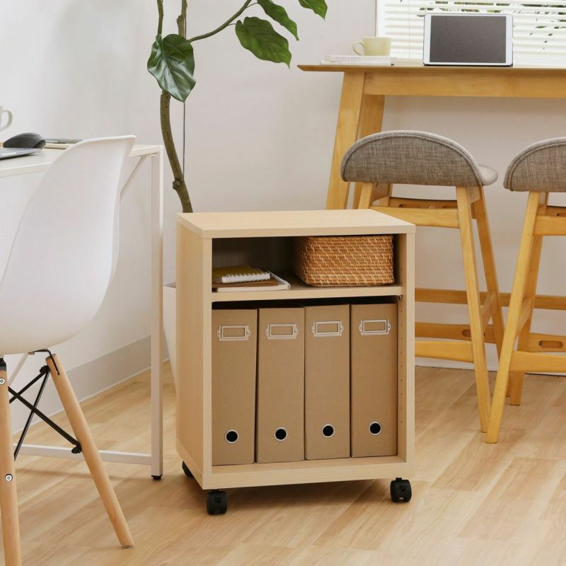 幅は約45cm。向きを変えればデスク下の足元に収まって邪魔にならないサイズです。A4サイズのファイルやファイルボックスを収納できるので、書類の整理に便利です。横型のファイルも収納できる奥行です。棚板は3cm間隔で調節できる移動棚。収納したい物に合わせて棚の高さを決めることができます。移動棚と背板の間には、配線用の隙間があります。移動棚に置いたスマホやタブレットの充電コードを通すことができます。背板に配線穴があるので、充電コードなどの配線を後ろに通すことができます。キャスター付きなので簡単に動かせます。デスクの下から出し入れしたり、必要なときだけ引き寄せて使ったりできます。取っ手が1つ付いています。デスク下から引き出すときにスムーズに動かせます。取っ手は左右どちらでも取り付けができるので、使いたい向きに合わせて向きを選択できます。