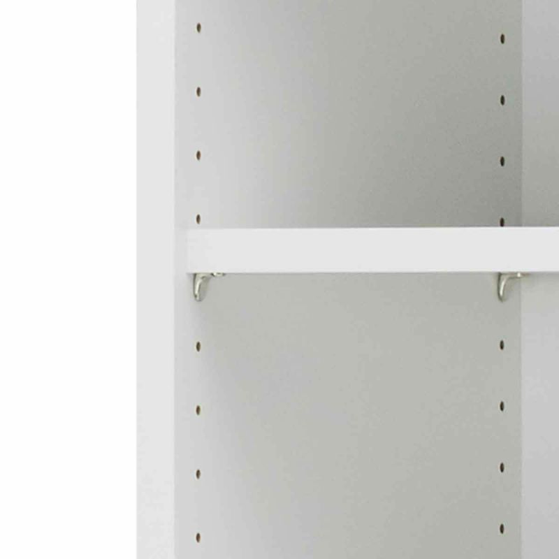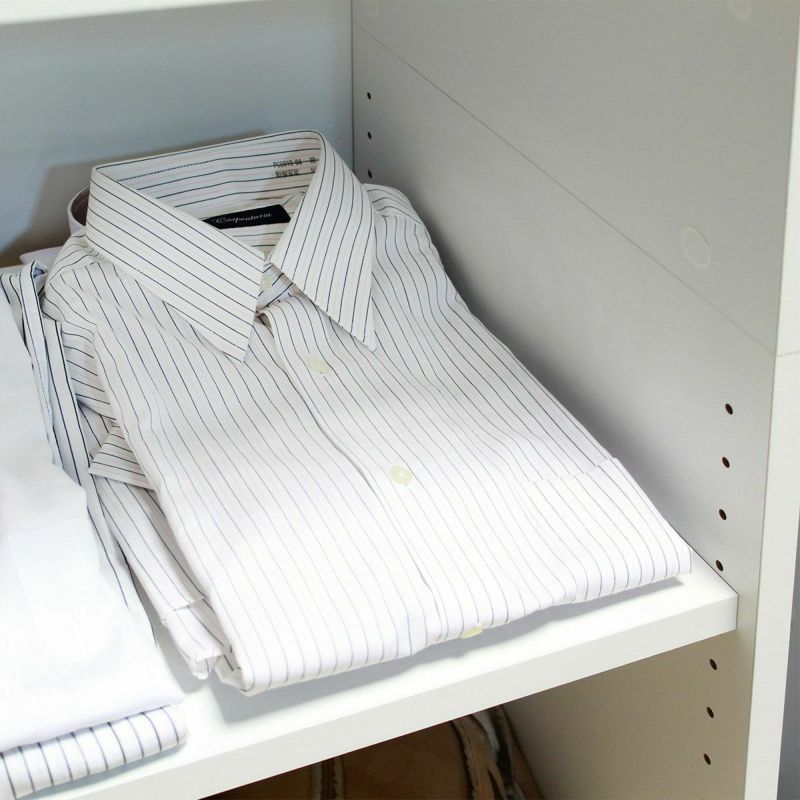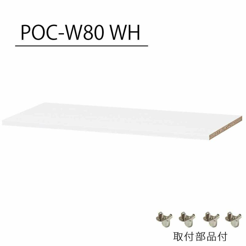 長期間閉めきった空間で使われることを考慮した低ホルムアルデヒド設計です。棚板の奥行有効内寸は約35cm。畳んだ衣類がぴったり収まる奥行です。4枚の棚板は可動式。収納物のサイズにあわせて棚の高さを変えることができます。棚板がもっと必要な方に。1枚から購入出来る棚板のみ(取付部品付)の販売をしています。POC-W80-WHをご購入ください。スーツケースや収納BOXの出し入れがしやすい、地板がない構造です。