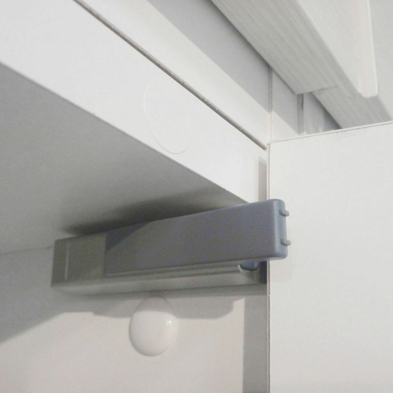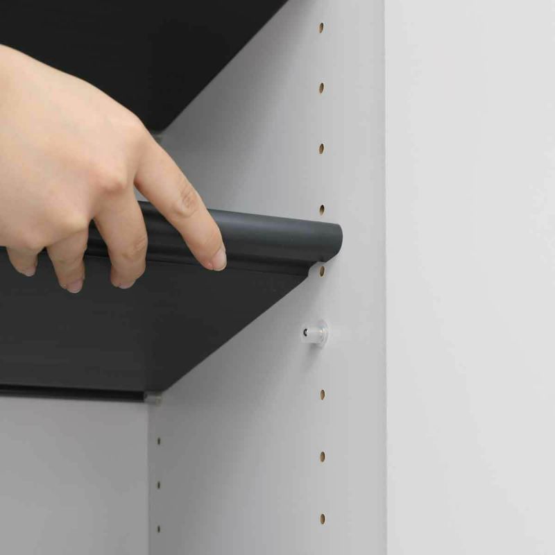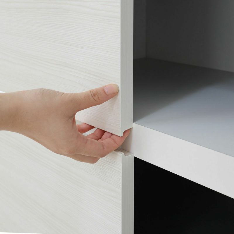 手にやさしい丸みのあるフォルムです。取っ手がないのでスッキリしています。扉がゆっくり閉じるダンパー機能。事故を防ぐ安心仕様で開閉音も静かです。棚板は汚れても水洗いのできる樹脂製になっています。