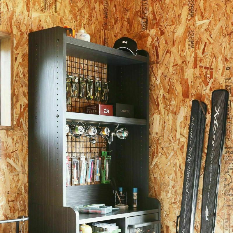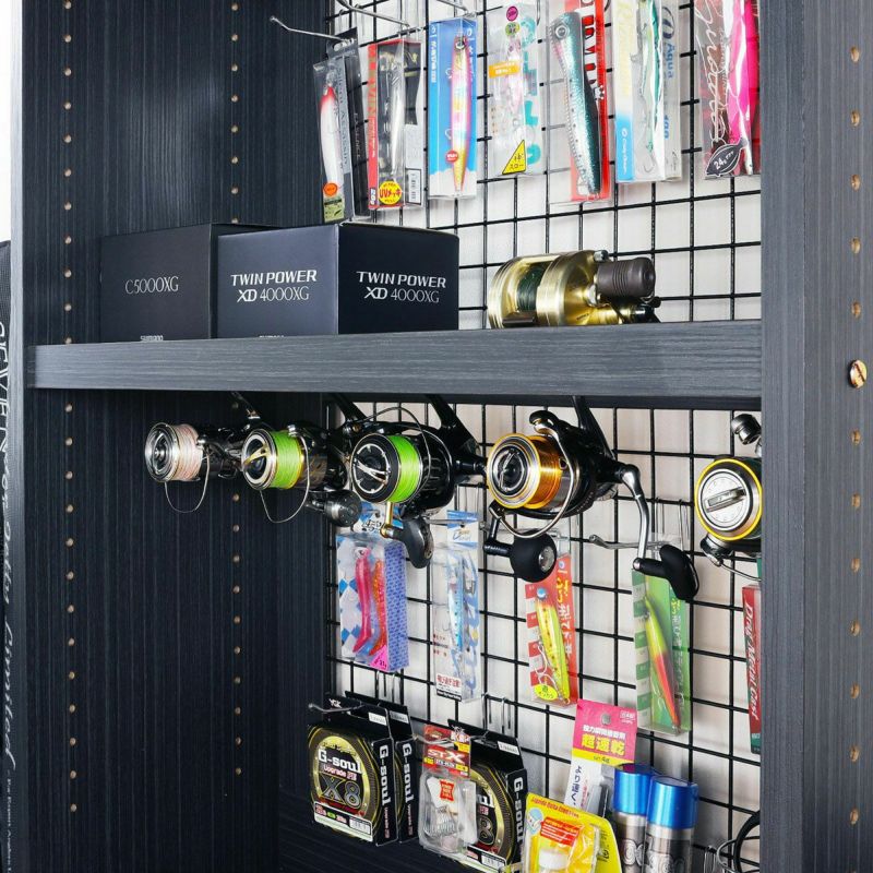 釣具収納 ワイヤーネットラック 幅80cm 高さ101cm ブラック 黒 木目 最大5台分リール棚板
