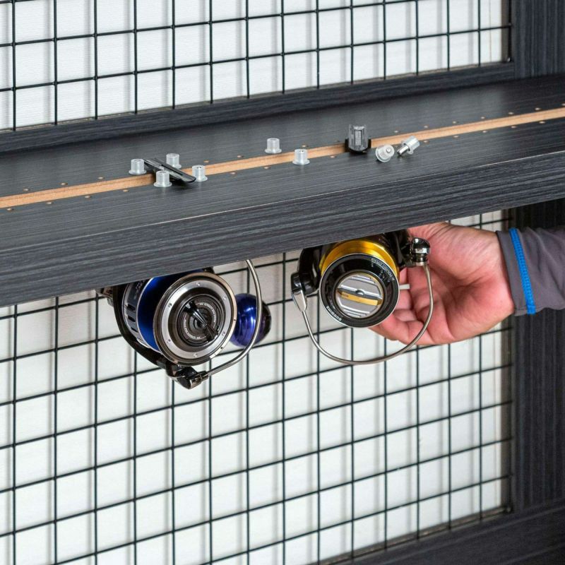 スピニングリール専用棚が1枚付いています。1段に5台までリールをディスプレイすることができます。市販のフックを使用すると、ルアーやライン各種小物をパッケージのまま店舗のように飾って収納することができます。取り外しが可能なリール落下防止の固定用ダボが付属されています。安心してディスプレイを楽しむことができます。