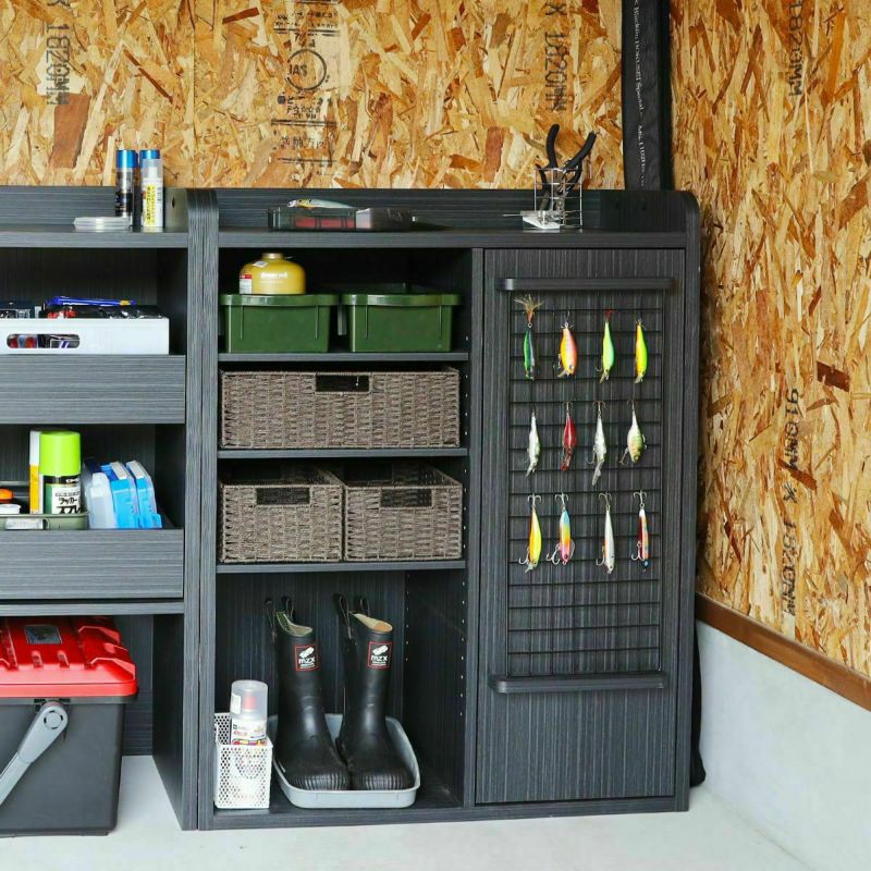 趣味の部屋やガレージをよりかっこよく魅せてくれるデザインです。ルアーを引っかけて飾ることができるディスプレイネット付き。お気に入りのルアーをおしゃれにディスプレイできます。市販の収納ボックスが入るサイズ設計です。紫外線による変⾊や、蛍光灯焼けを防ぐため扉収納。リールの箱や、ヴィンテージルアー、高額ルアーの在庫置場に。低圧メラミンの天板なので水をはじきます。天板は傷に強い低圧メラミンを採用。立ったままフックやリング交換、リールのメンテナンスを行えるようにしました。別売のPSR-1080BKと連結することができます。オプションで組立サービス(有料)が選択できます。専門スタッフが組み立てた、組立済みの商品を玄関までお届けします。