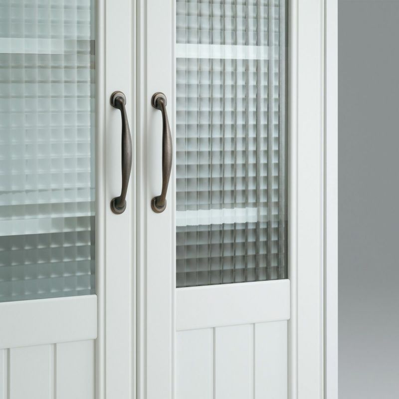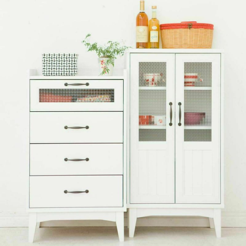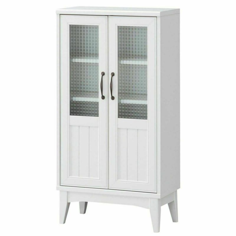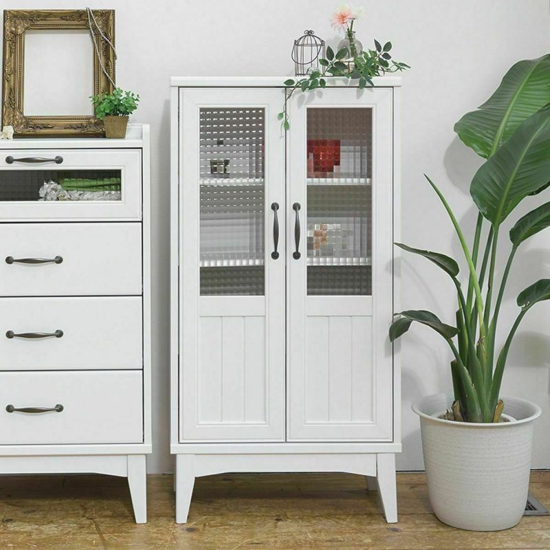 キャビネット 棚 幅57cm 高さ109cm ホワイト 白 型ガラスの扉 レトロな取っ手 かわいいフット