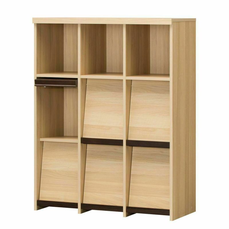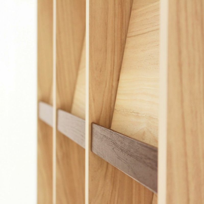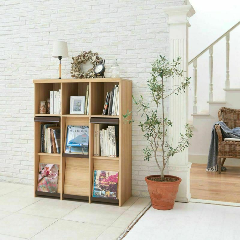 オープン棚は飾り棚、フラップ扉には本や雑誌をディスプレイ、扉内には隠す収納と使い分けができます。ダークなアクセントカラーが全体を引き締めるフラップ扉の木製取っ手。1マスのサイズは高さ30cm以上。A4ファイルが入るサイズです。扉の前面に雑誌などをディスプレイできる扉。雑誌を乗せたまま棚内上部にすっきり収まります。フラップ扉は、上に引き上げ押し込んで収納します。オープン時も邪魔にならない構造です。フラップ扉を収納する際、人が力を入れやすくスムーズに動くよう、溝をウェーブ状にしています。自然の素材感が表現された、優しい印象を与える木目調となっています。