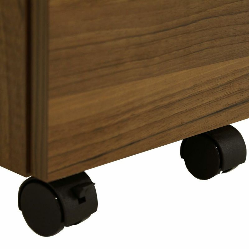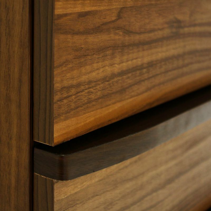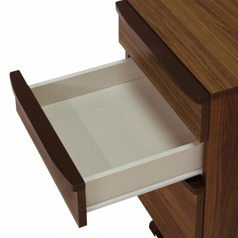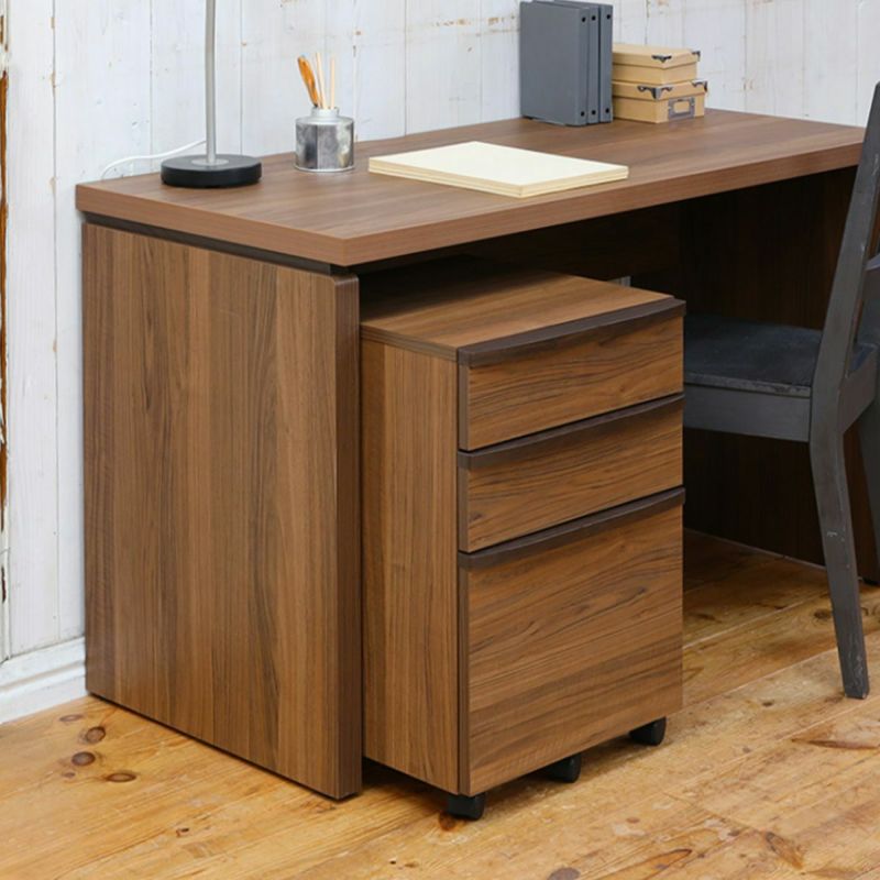 同シリーズの浅型デスクと深型デスクどちらにでもぴったり収まるサイズです。取っ手は全体を引き締めるダークブラウン。スタイリッシュな印象を与えます。引き出しはスチール製のスライドレール。丈夫で滑らかな開閉ができます。キャスターはストッパー付き(5個中2個)。動かしたいときやお掃除のときに移動が簡単です。最下段の引き出しには補助用のキャスター。重たい書類が詰まった状態でも引き出しやすい仕様です。置き場所を選ばない背面化粧仕様。