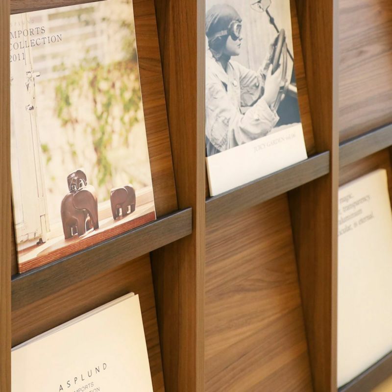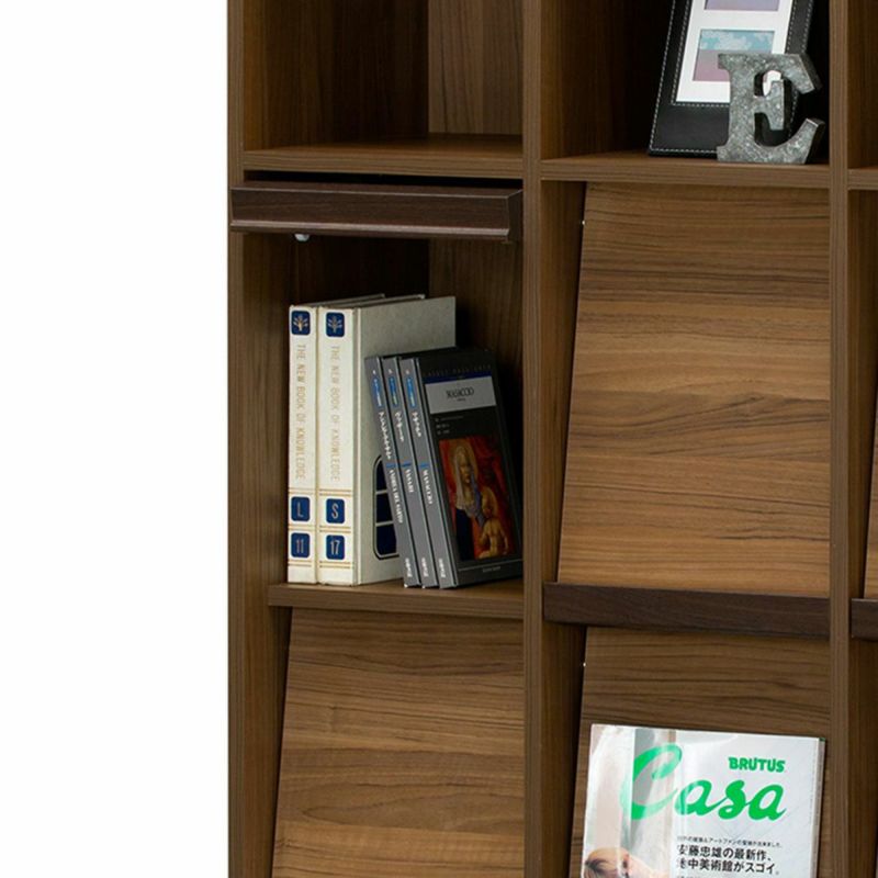 ダークなアクセントカラーが全体を引き締めるフラップ扉の木製取っ手。1マスのサイズは高さ30cm以上。A4ファイルが入るサイズです。