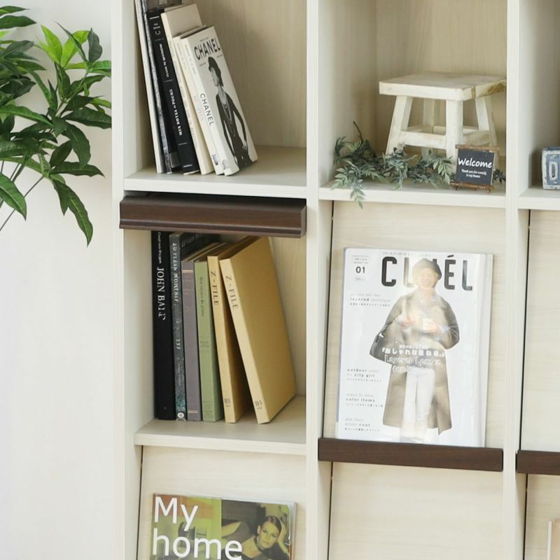 ダークなアクセントカラーが全体を引き締めるフラップ扉の木製取っ手。1マスのサイズは高さ30cm以上。A4ファイルが入るサイズです。