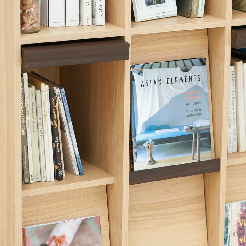 ダークなアクセントカラーが全体を引き締めるフラップ扉の木製取っ手。1マスのサイズは高さ30cm以上。A4ファイルが入るサイズです。