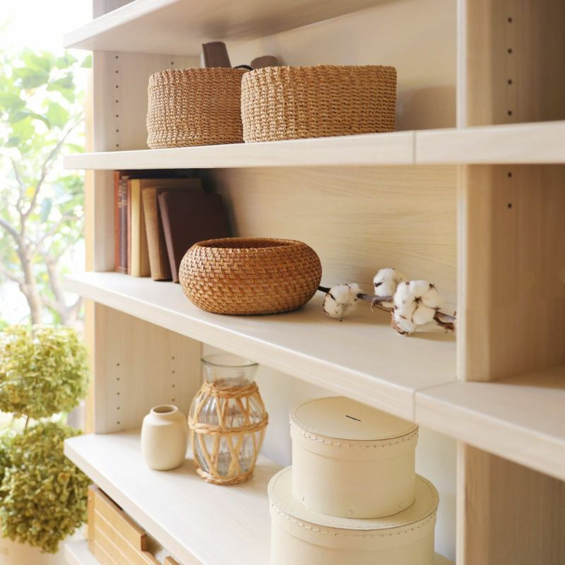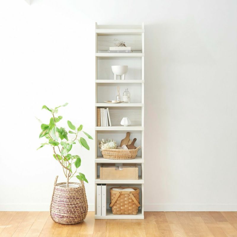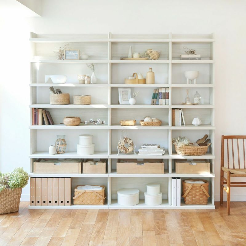 厚い棚板が力強く存在感を放つ大型オープンラックです。複数を並べると一枚の板が端から端に通った造り付けの棚のようになります。一日に何度も眺めてしまう、自慢の収納をつくることができます。
