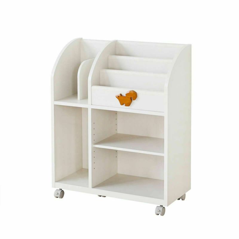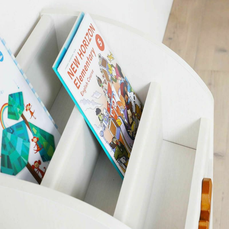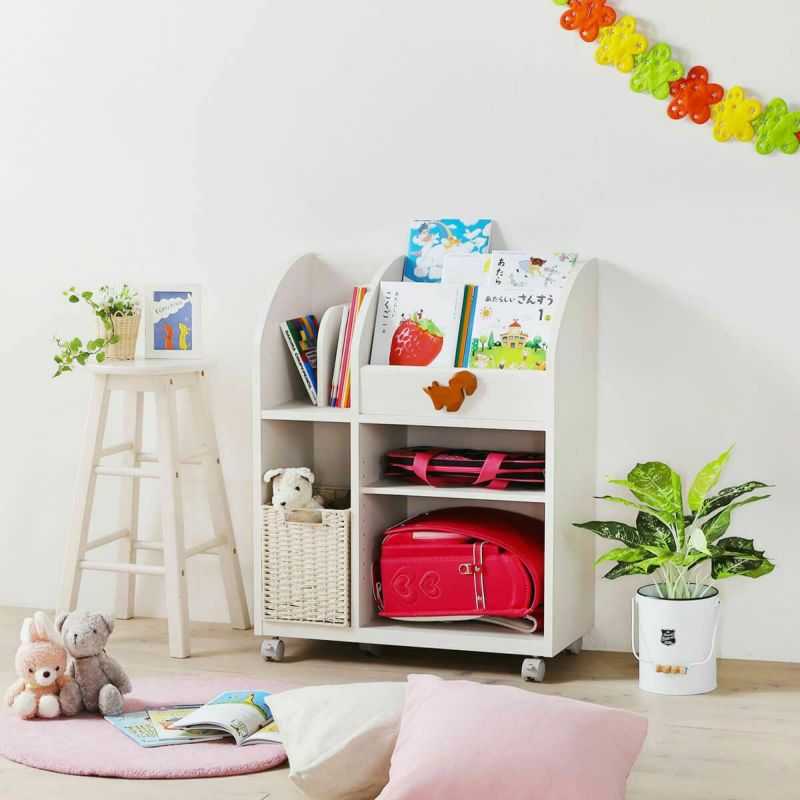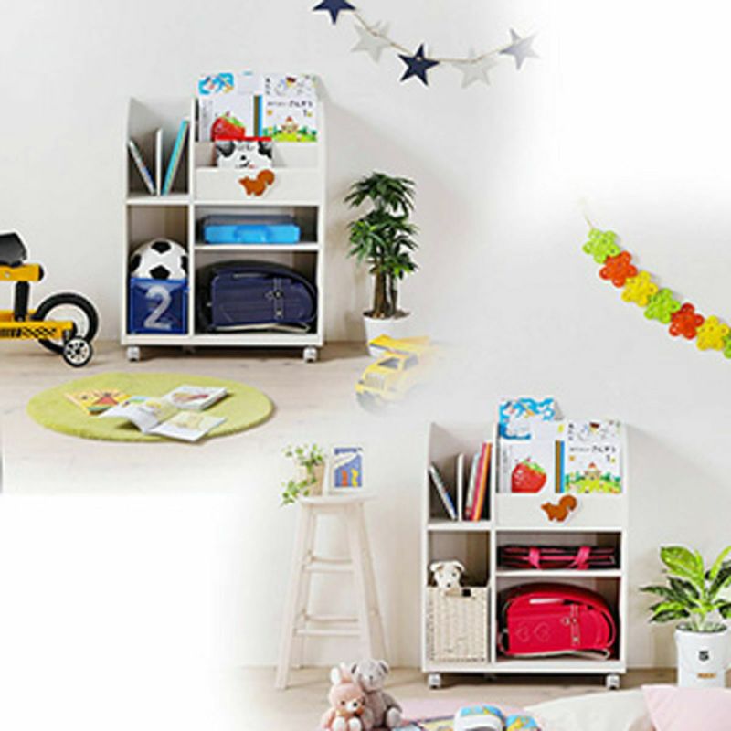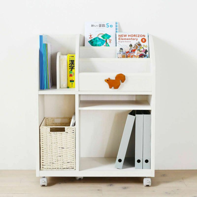 収納場所が一目でわかるようにデザインしました。お片付けを習慣化しやすいランドセルラックです。性別にかかわらず、使える白木目。子供の好みに合わせやすいカラーです。上部右側の本棚は子供も選びやすい表紙を見せて収納するタイプ。底板が斜めになっているから前倒れしにくく、しっかりと表紙が見えます。リスをモチーフとしたオーナメントは、北欧風のかわいいデザイン。男の子にも女の子にも人気の動物です。下部右側の棚は可動式です。棚の位置を調節すれば教科書収納として使えるので、高学年になって増えた教科書やノートも収納できます。掃除のときにすぐに動かせて便利なキャスター付き。子供の成長に合わせて学習場所をリビングから自室へ移動するときも簡単に移動できます。背面が化粧されているので、壁面を背にしなくても使えます。
