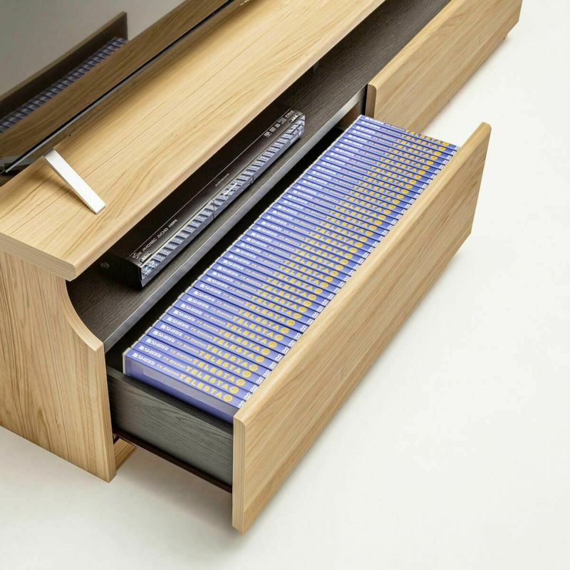 天板のやわらかなラインと趣のある木の質感がやさしい印象を与えてくれます。スチール製で丈夫なスライドレールの引き出しには、左右それぞれ44枚、計88枚のDVDが入ります。表からは見えない引き出しの底面。桟を入れて強化をしているから、たくさん収納しても安心して使えます。引き出しは下の手掛けで開けるから、取っ手のないフラットなデザイン。無駄がなくすっきりしています。天板下のオープン部分には、左右それぞれ配線穴があります。配線を傷つけにくいゴムコーダー付きです。天板は本体よりも1.5cm後ろにせり出しています。壁と本体の間に隙間をつくり、配線と巾木をよけることができます。あらかじめ取り付けてある部品に接着剤をつけてはめるだけの引き出し組立簡単部品「フクイック」を使用しています。