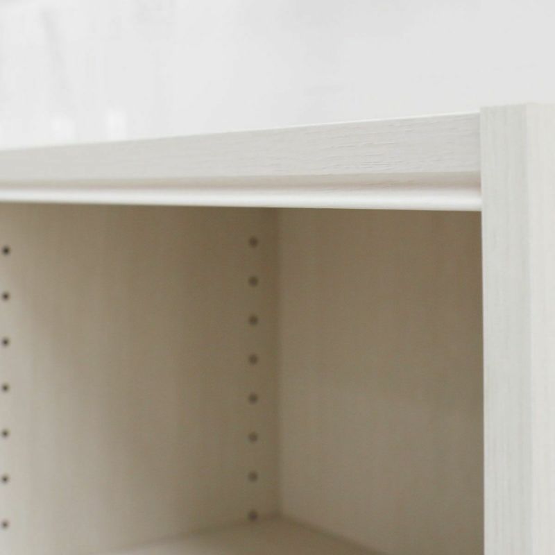 天板にはやわらかく彫り込んだライン。優しい影が表情をつくります。木口には、木の凸凹まで再現した3Dエンボス加工のテープを使用しています。本体の広がりを抑える機能を強化したオリジナルの棚受け金具を使用することで、すべての棚をお好みの位置に移動できます。壁とラックの間に隙間があかないよう、巾木をよけるための加工がされています。シライオリジナルの棚受け金具を使うことで、全ての棚板の高さを調節できるようにしました。