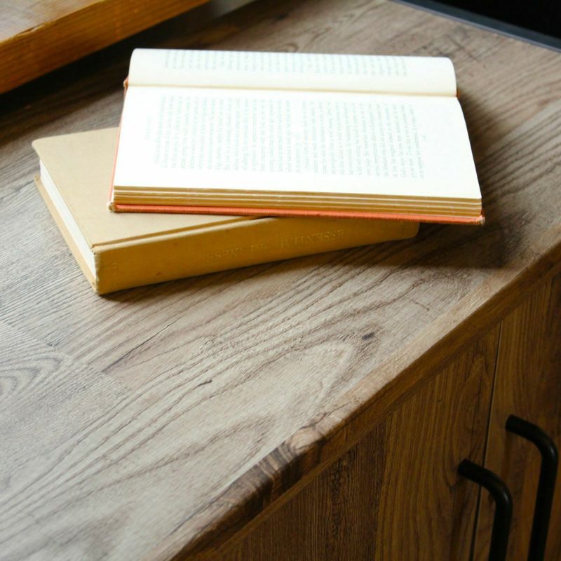 長年使いこんだような雰囲気の古材風シートや、艶消ししたアイアン調の取っ手が”男前インテリア”を演出します。両側板のブラックボードが家具全体を引き締め、インダストリアル風の部屋にぴったりなテイストです。「タナクイック」は、あらかじめ工場で取り付け済みの部品でパチッと止めて、付属の専用工具で固定するだけ。ドライバーを使わずに組立ができる部品です。