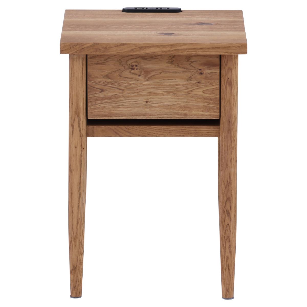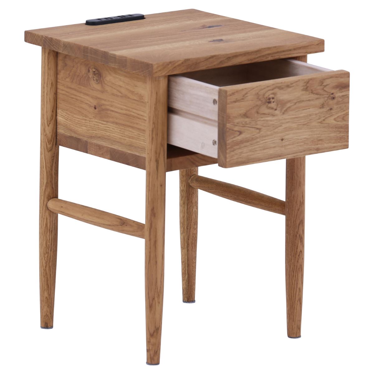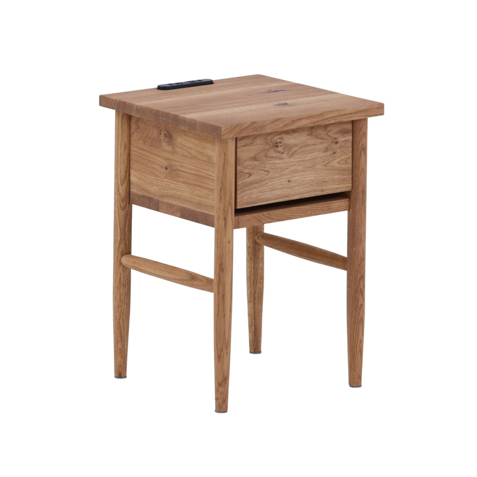 幅32㎝、高さ45㎝のスリムでコンパクトなナイトテーブルです。軽くて持ち運びが簡単なので、ソファの横でサイドテーブルとしても使用できます。2口のコンセント付きです。同じクレマシリーズでベッドフレームも展開しています。
