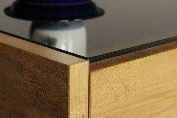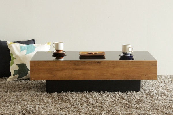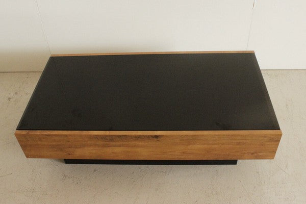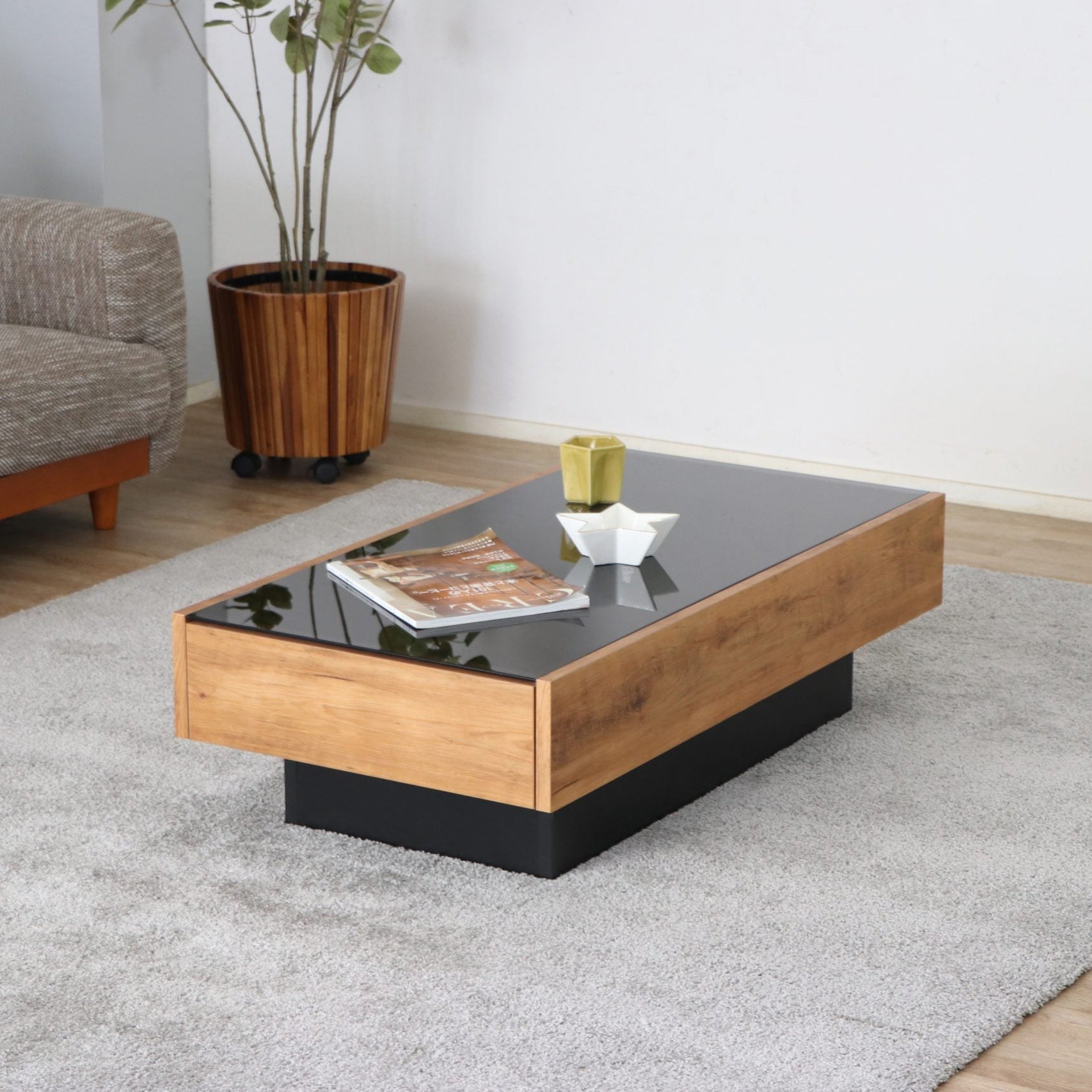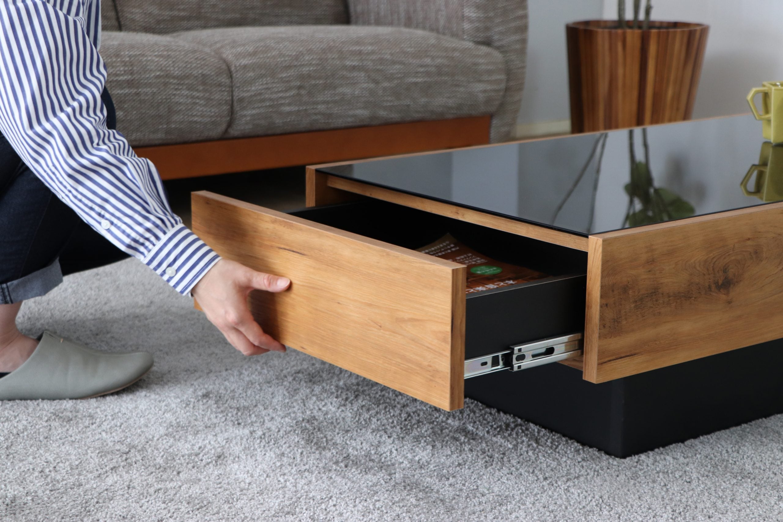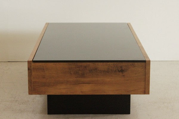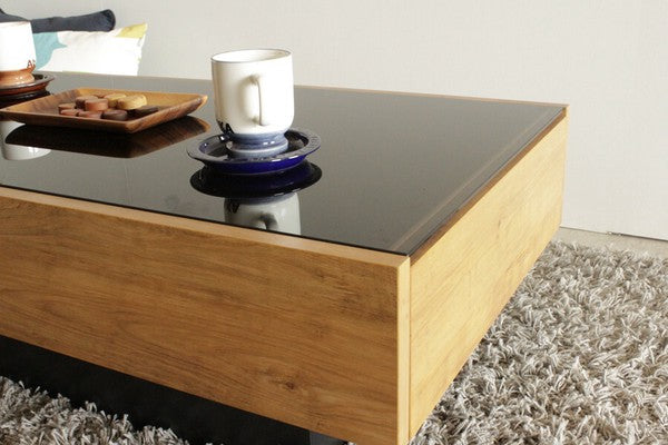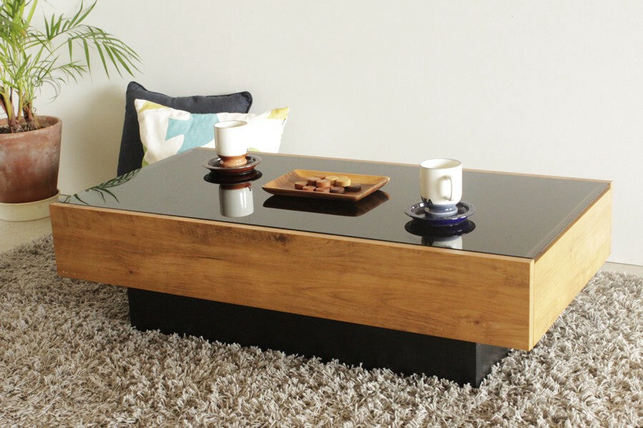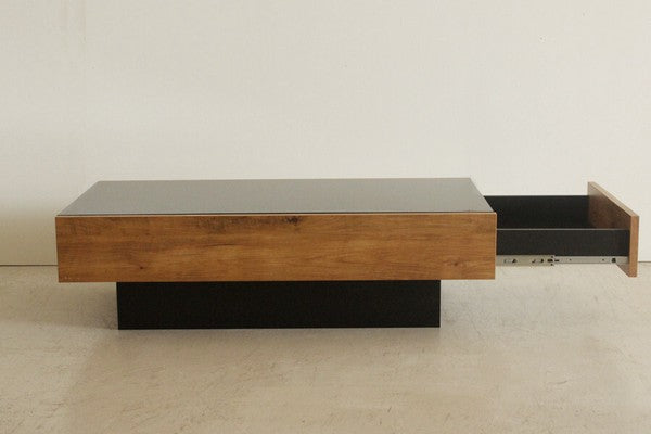 ヴィンテージ調の木目柄が特徴の国産テーブルです。フラットなデザインで、片側にたっぷり収納できる引出付。ヴィンテージ調の木目と、黒ガラス天板のコンビがおしゃれです。