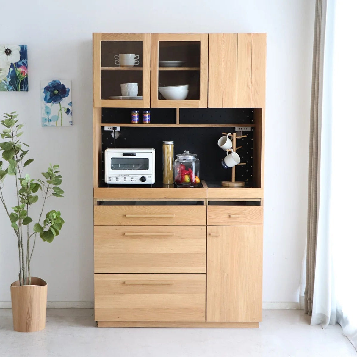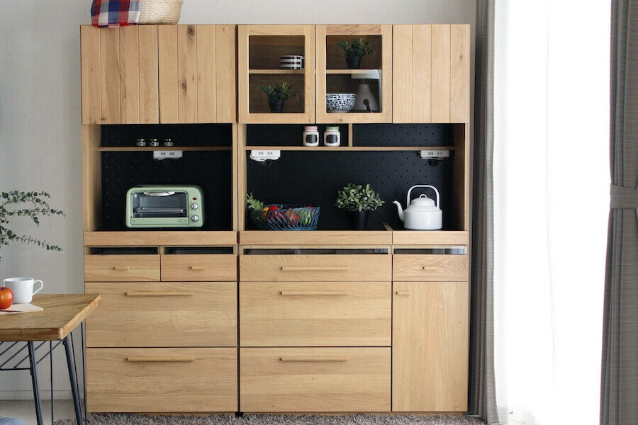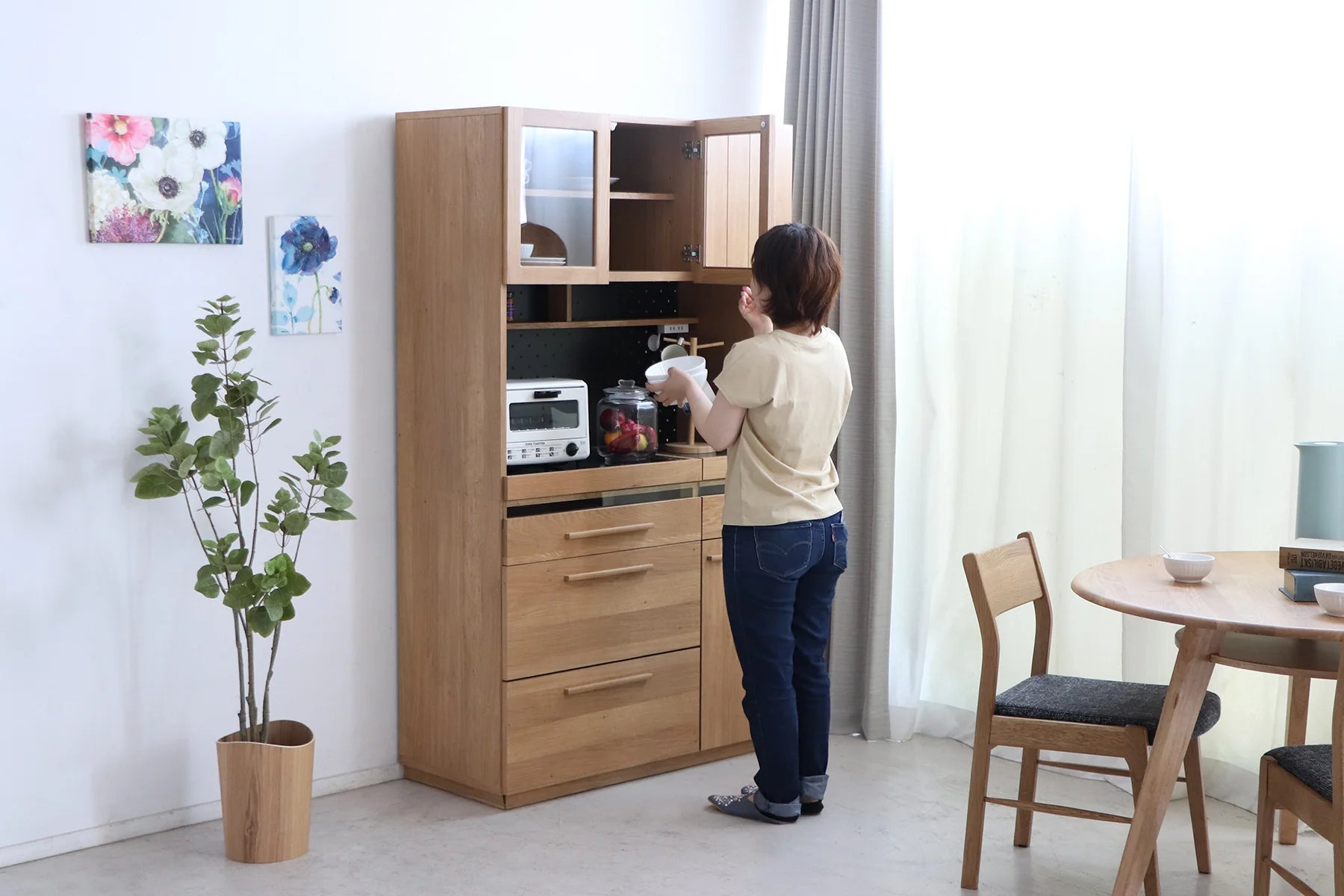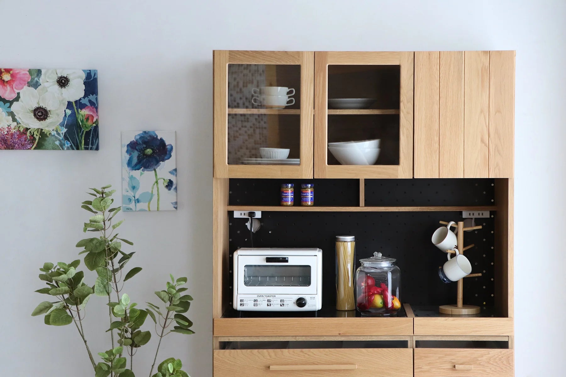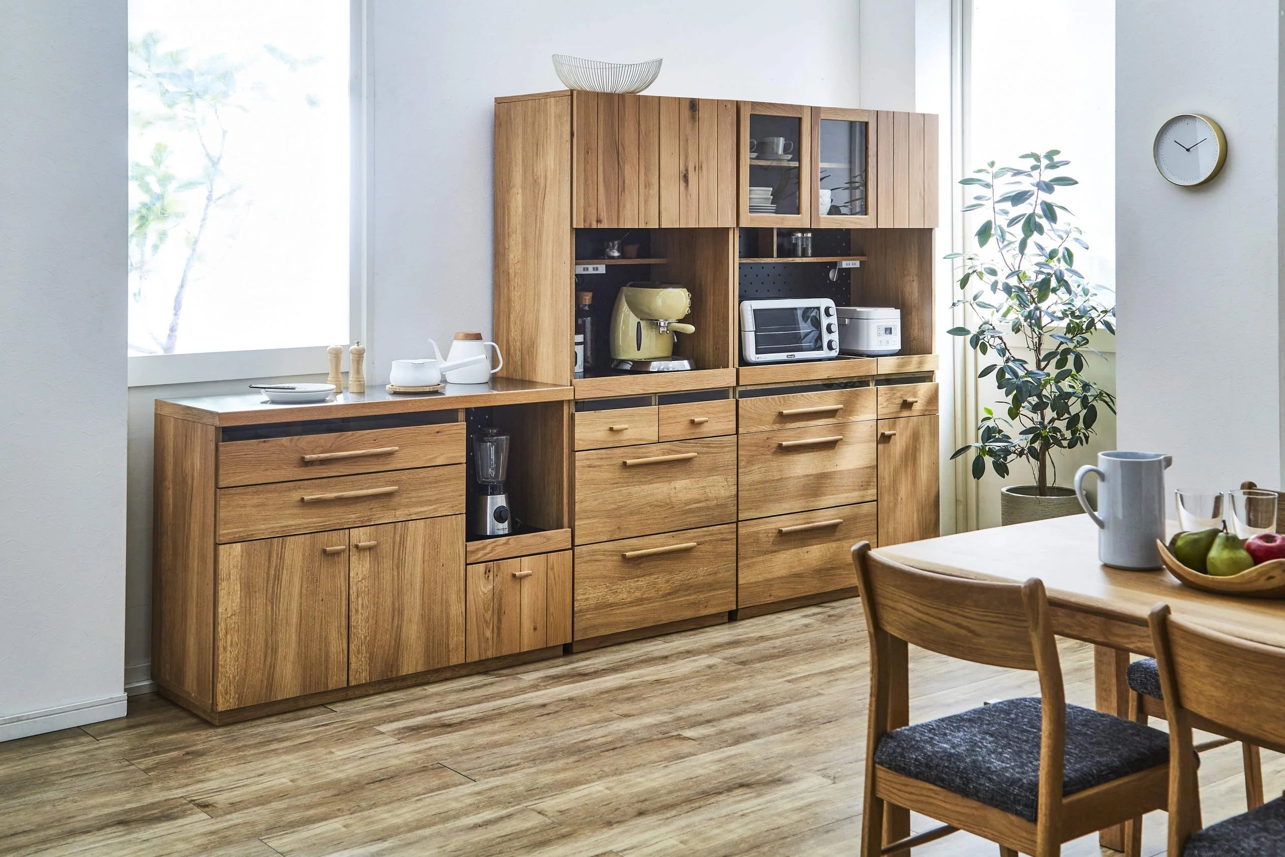 木目の美しさが映えるシンプルなモダンナチュラルデザインのキッチンボードです。前板に縦についたラインがおしゃれなアクセントになっています。引出しにはたくさんのカトラリーやランチョンマット、その他小物がたくさん入るスペースが確保されています。コンセントがついているのでトースター、レンジももちろん置けて便利です。いつもの食卓をおしゃれにおいしくいただけるキッチン収納です。
