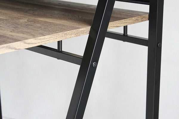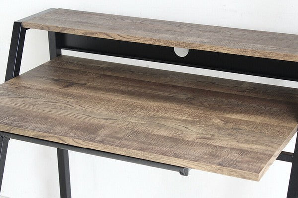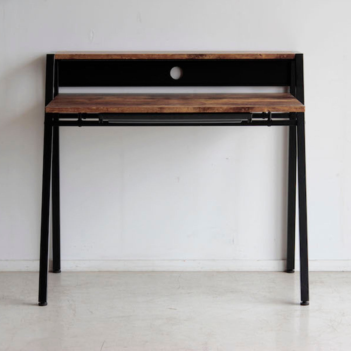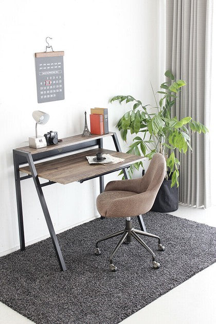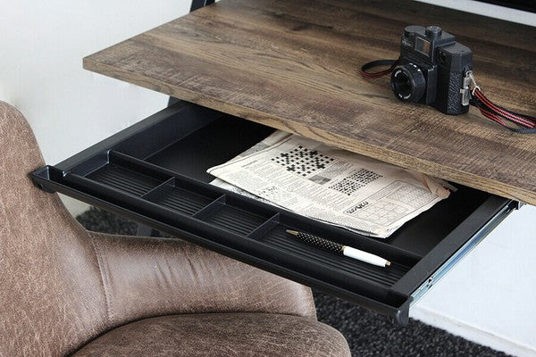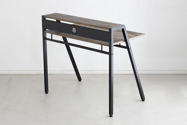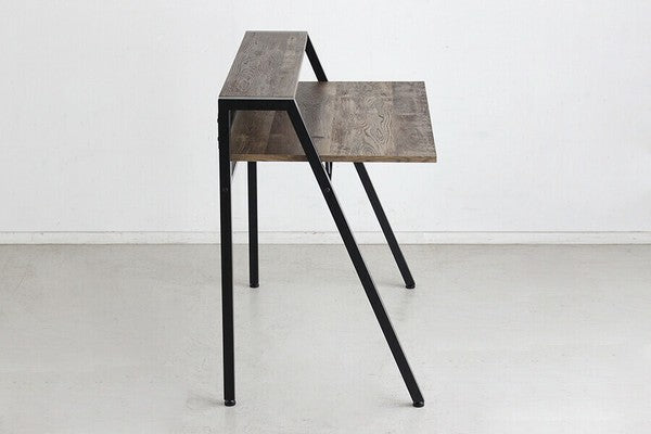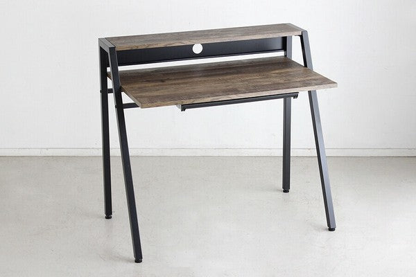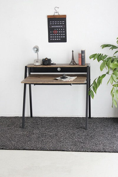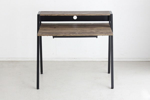 シンプルながら全体的にバランスよくまとまったシャープでスタイリッシュなデザインのデスクです。机の下に仕切りの入ったトレー付きで文具や書類の整理ができます。質感のあるダークブラウン色がメンズライクで素敵な印象です。コード穴が背面に空いているのでパソコン配線をすっきりまとめることができます。薄型で便利な書類や小物収納引出付ダークブラウン色古木柄とブラックで仕上げたフレームとの相性も抜群です。