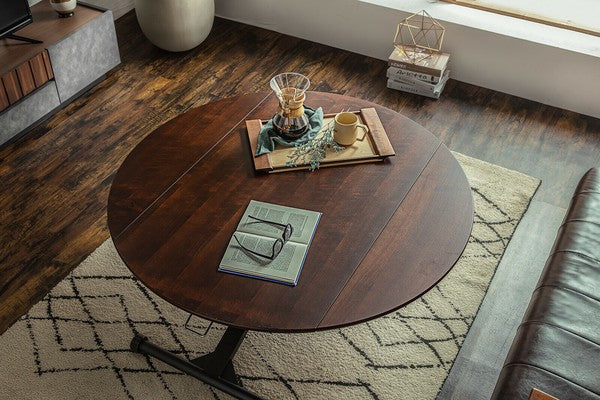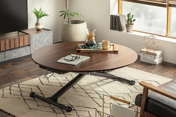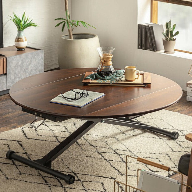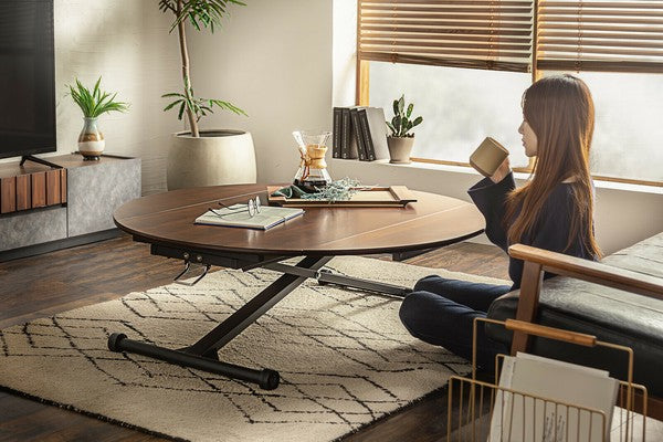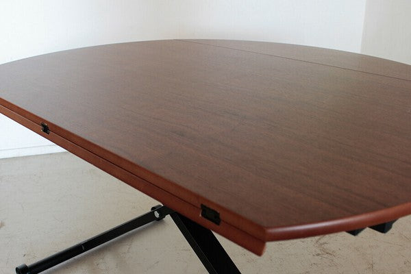 伸長する天板と昇降機能がついている万能テーブルです。リビングからダイニングまで提案ができるアイテムです。選べる4色!空間の雰囲気に合わせて好きな色を選択できます。低くしてリビングテーブルとして置き、来客の際に広げたり?高くして円状のダイニングテーブルとして使用したり?片側だけ広げて壁付けしておいてサイドで使用したり 使い方広がる、アイテムです。