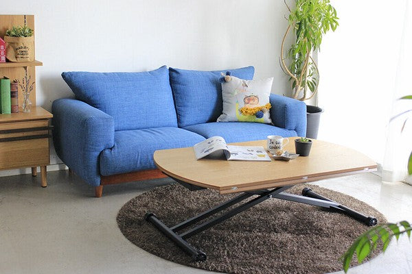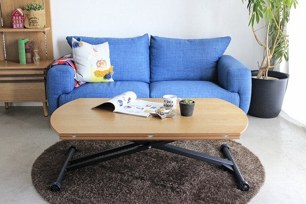 伸長する天板と昇降機能がついている万能テーブルです。リビングからダイニングまで提案ができるアイテムです。選べる4色!空間の雰囲気に合わせて好きな色を選択できます。低くしてリビングテーブルとして置き、来客の際に広げたり?高くして円状のダイニングテーブルとして使用したり?片側だけ広げて壁付けしておいてサイドで使用したり 使い方広がる、アイテムです。