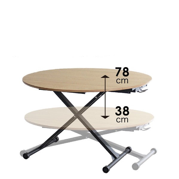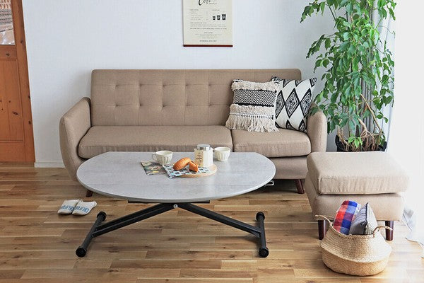 伸長する天板と昇降機能がついている万能テーブルです。リビングからダイニングまで提案ができるアイテムです。選べる4色!空間の雰囲気に合わせて好きな色を選択できます。低くしてリビングテーブルとして置き、来客の際に広げたり?高くして円状のダイニングテーブルとして使用したり?片側だけ広げて壁付けしておいてサイドで使用したり 使い方広がる、アイテムです。