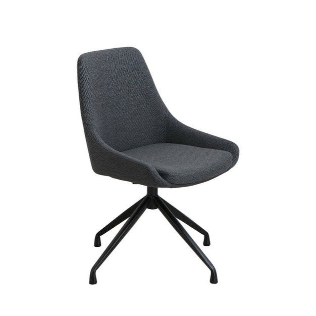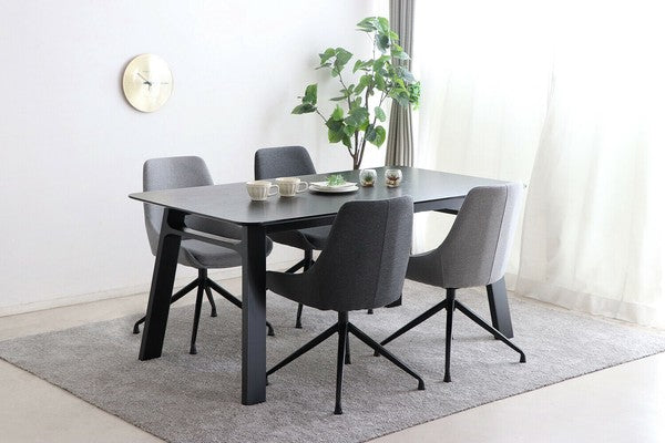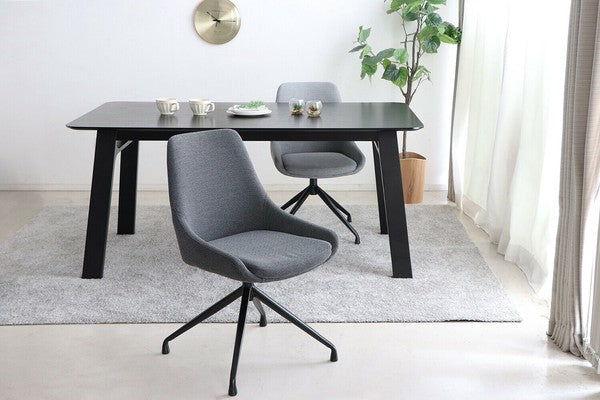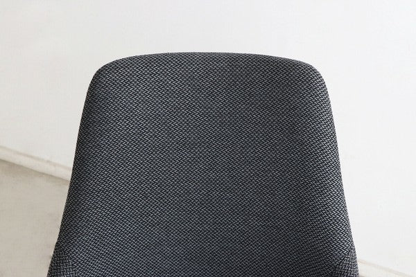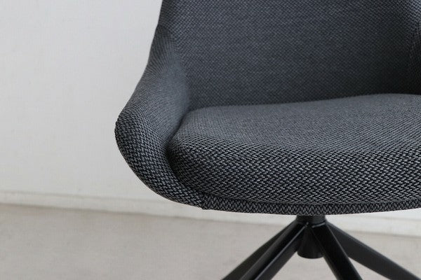 座ったり立ったりがスムーズでとても楽なラウンド式のチェアです。引きずったりする必要がないので床にも優しい仕様となっています。ファブリック柄なので、群れたり、冬のひんやり感もなく優しい雰囲気です。背もたれの上部分の手持ち機能も便利。肘無しなので、座面がテーブルにすっぽりと納まります。背もたれから座面の横からのラインもオシャレポイント。