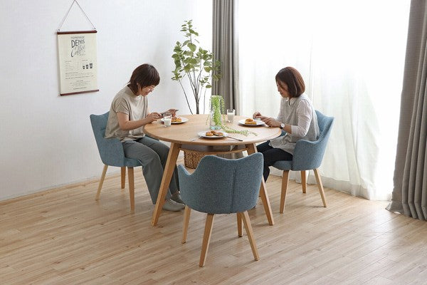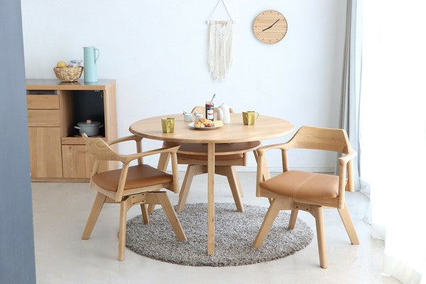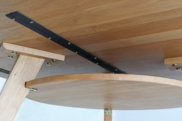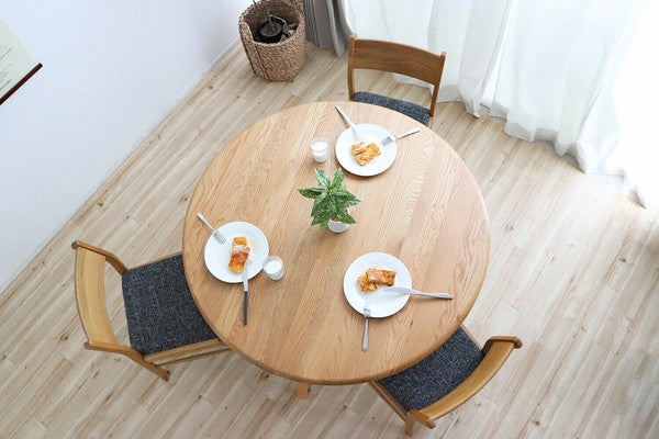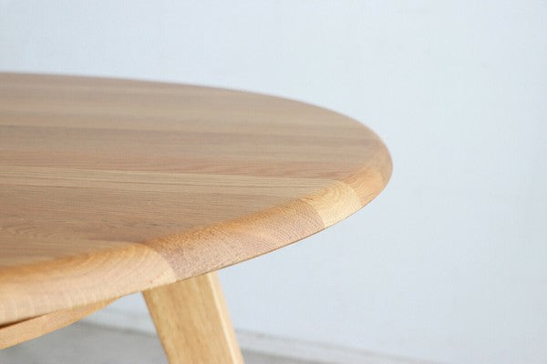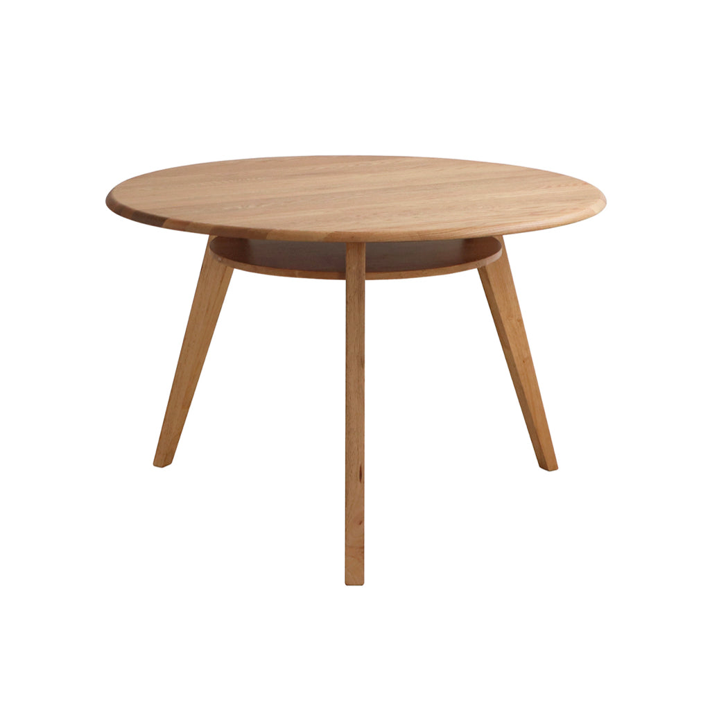 人気の円形ダイニングテーブルです。オーク無垢材と角を取った縁のディテールが空間全体を柔らかい印象にしてくれます。ナチュラルなテイストはどんな空間にもぴったりフィットします。中棚が付いていますのでちょっとした小物が収納可能です。脚部は価格を抑えたラバーウッド無垢を仕様。シンプルなデザインのため様々なチェアとコーディネート可能です。