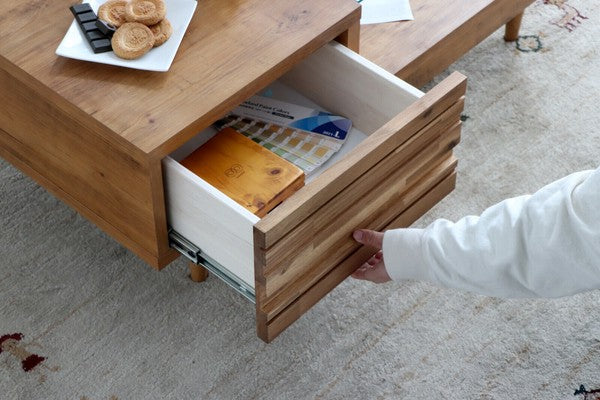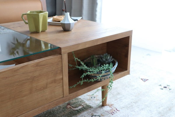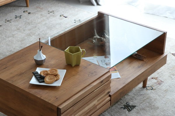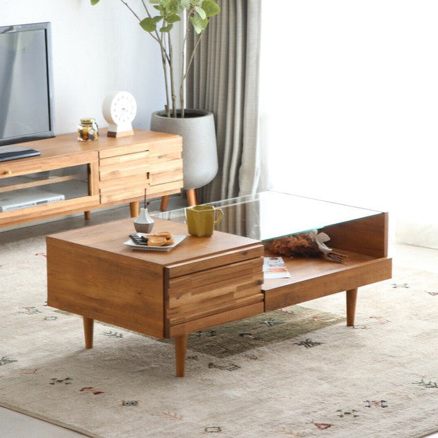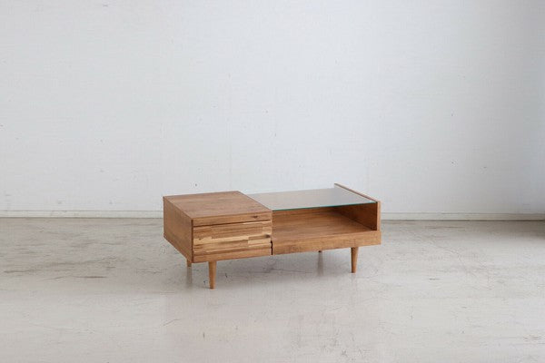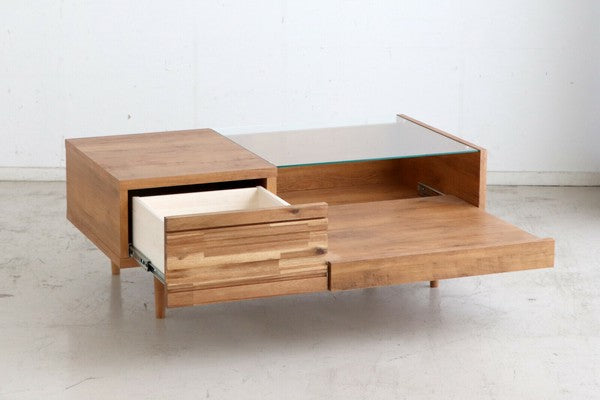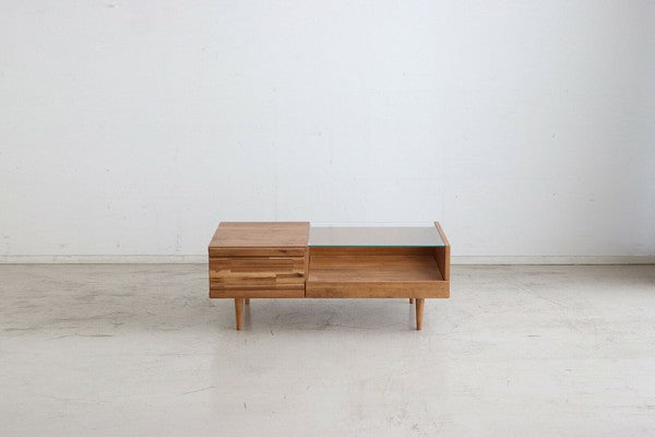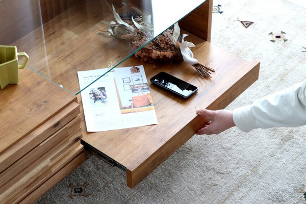 凹凸を出したアカシア無垢材が、立体感と奥行きを出してくれるリビングテーブルです。ガラス越しに魅せる収納は、引き出し機能がついており便利に活用できます。細身の脚にも拘っているおしゃれなアイテムガラス天板下の棚はスライドテーブル仕様で出し入れが簡単です。