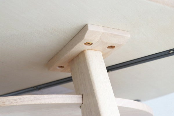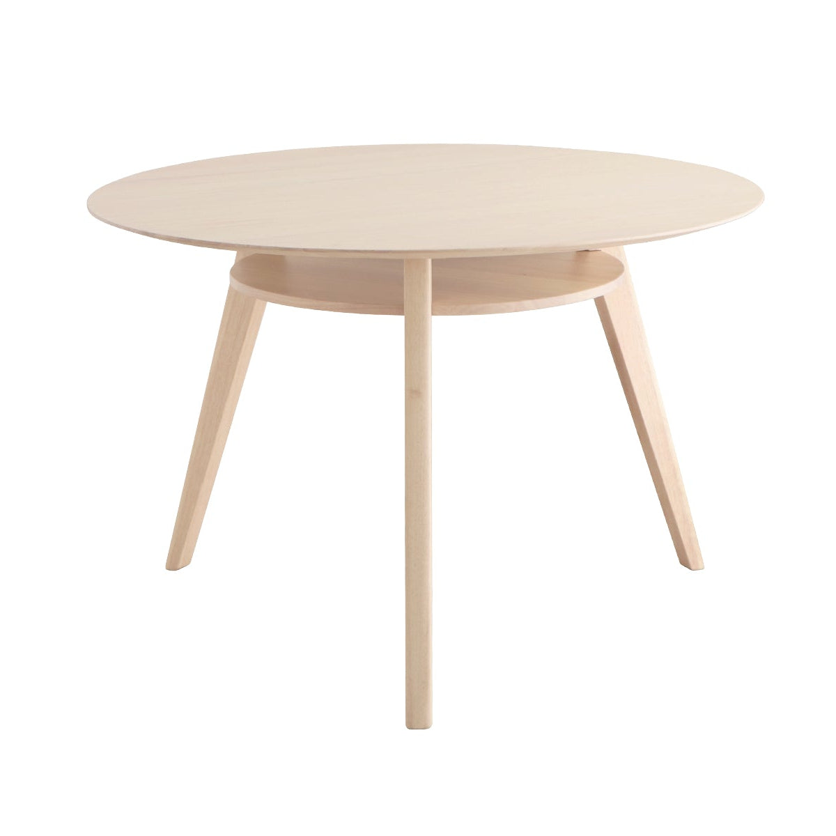 アッシュ材の木目を生かした、ホワイト仕上で木の存在感いっぱいのテーブルです。円形なので角がない嬉しいアイテム。便利な棚付きで、小物が収納できテーブル上もすっきりにホワイトが家の中を明るくします。ミルキーホワイトカラーはこれからのトレンドに。