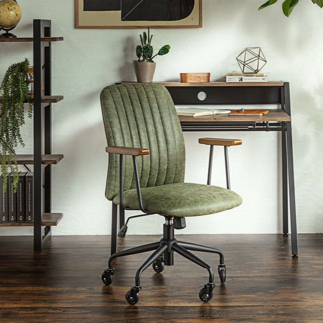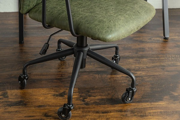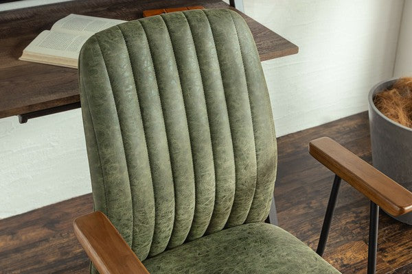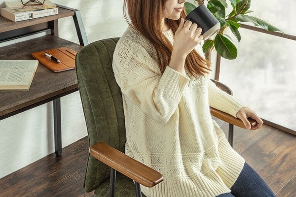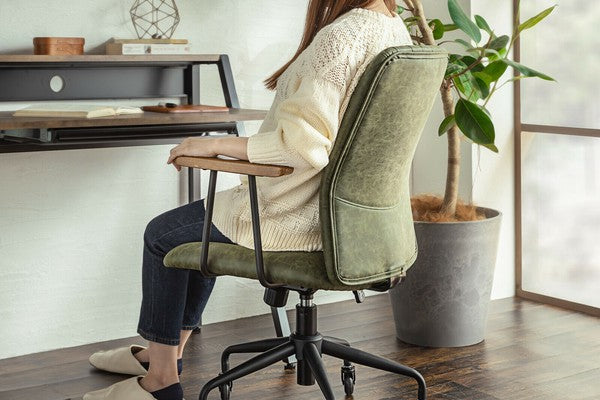 縦ラインがアクセントのビンテージチェアです。艶のないPU合皮を採用肘置きの木部と相まって大人の渋みのあるオフィスチェアにしました。書斎や個人スペースの空間にぴったりのデスクチェアとなっております。キャスターにもこだわりがあり他のチェアとは別のかっこよさがあります。