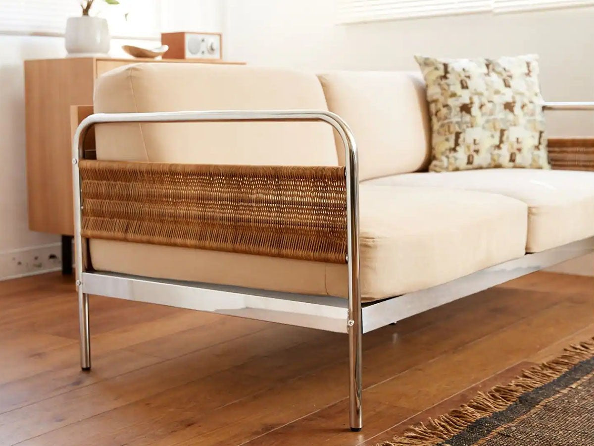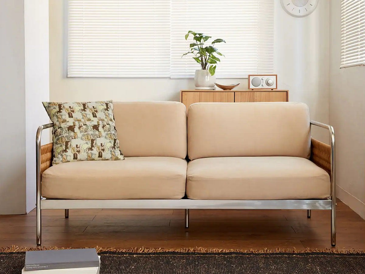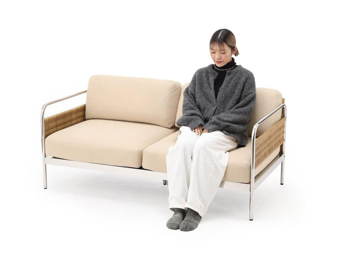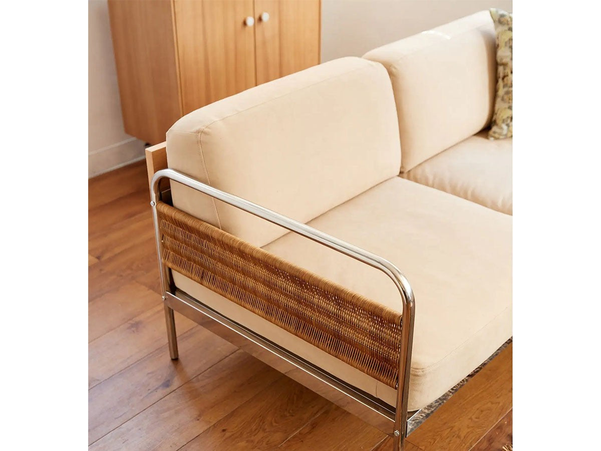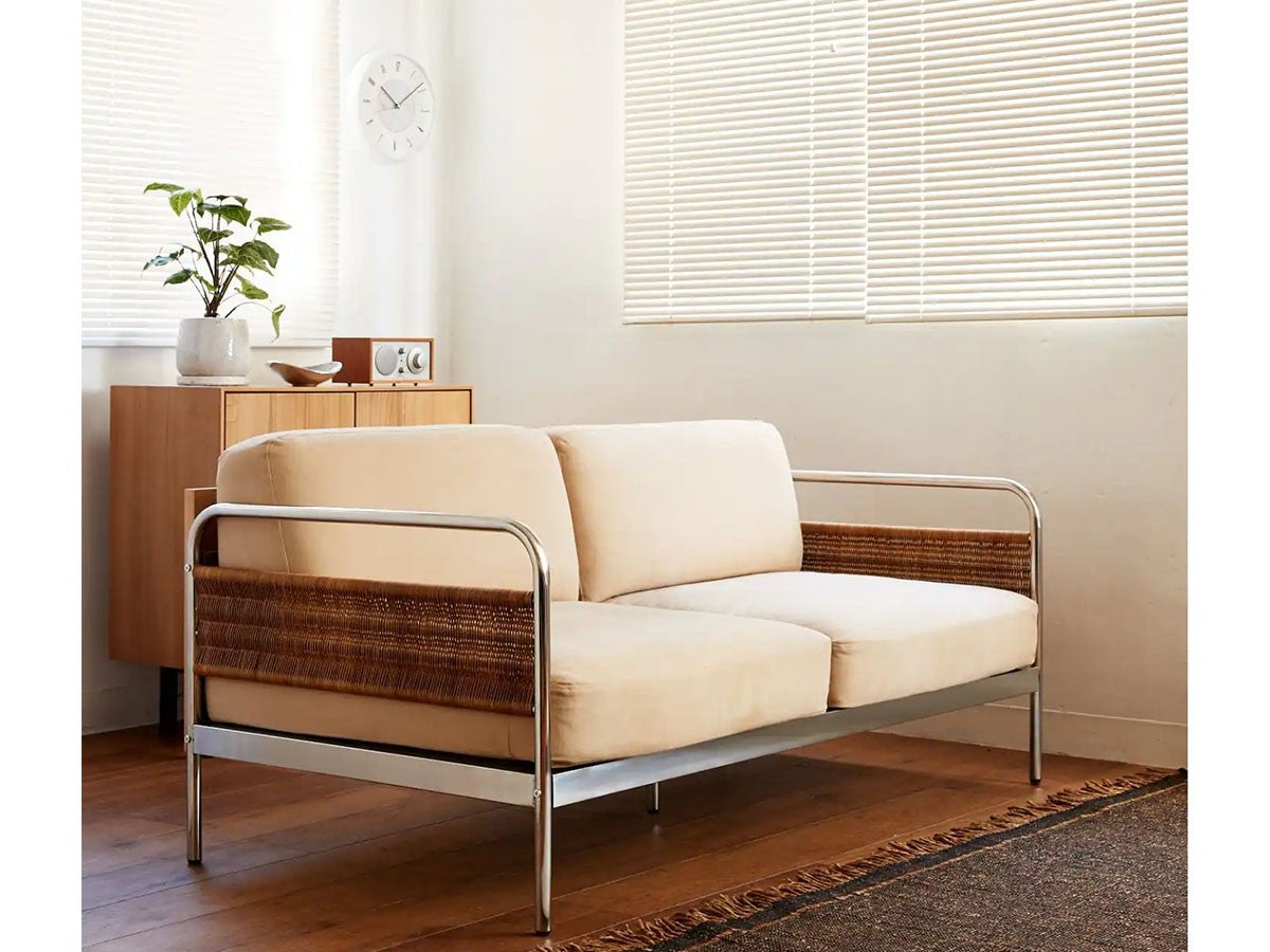 オランダのヴィンテージソファをベースとして、リデザインされた2人掛けソファ。フレームのステンレス、ラタン、木、スエード調の張地と、異素材をミックスすることで、パーツ毎に異なる質感を楽しめ、飽きのこないデザインとなっています。座面は硬めで、安定感のあるしっかりとした座り心地です。クッションは座と背ともにカバーリング仕様となっており、ドライクリーニングでお手入れが可能です。フレーム本体は組み立て式のため、搬入経路が狭い住宅にもおすすめです。