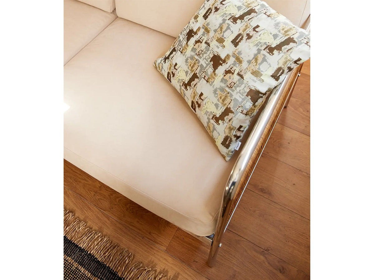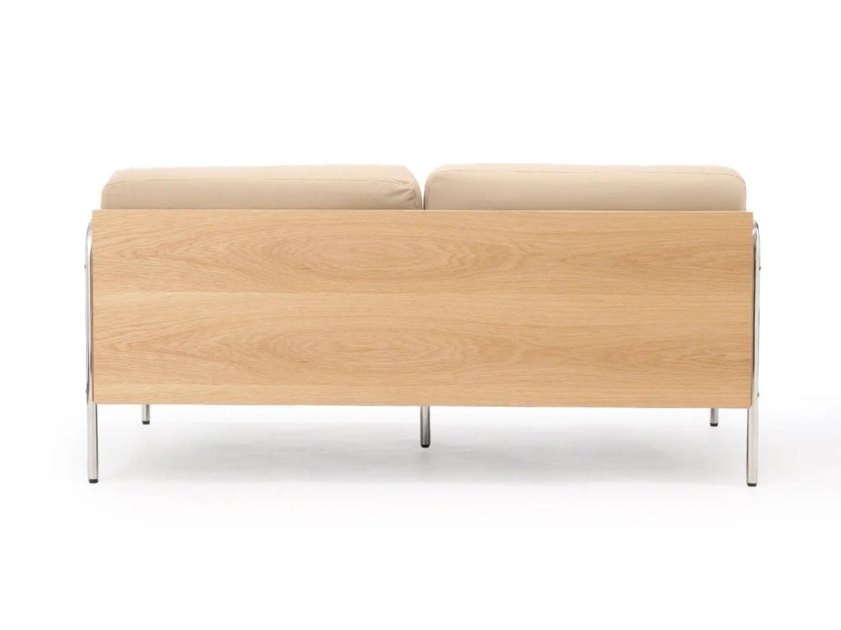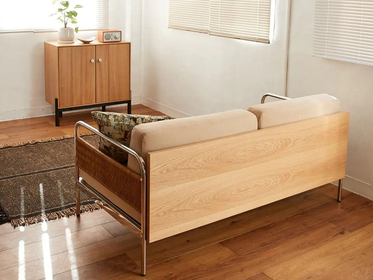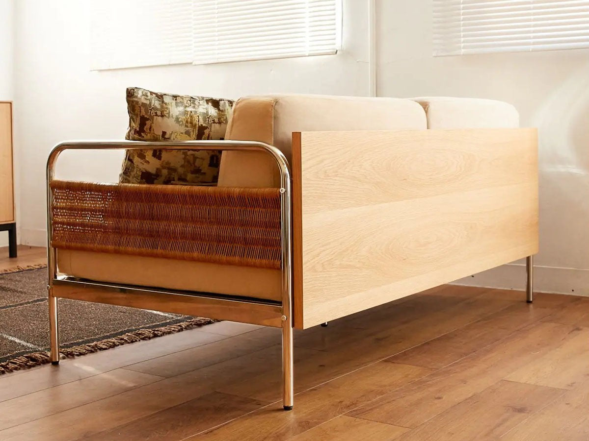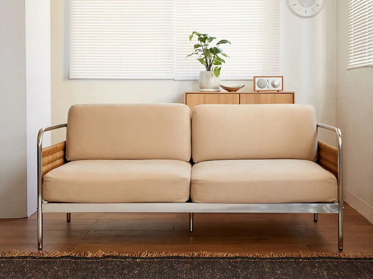 オランダのヴィンテージソファをベースとして、リデザインされた2人掛けソファ。フレームのステンレス、ラタン、木、スエード調の張地と、異素材をミックスすることで、パーツ毎に異なる質感を楽しめ、飽きのこないデザインとなっています。座面は硬めで、安定感のあるしっかりとした座り心地です。クッションは座と背ともにカバーリング仕様となっており、ドライクリーニングでお手入れが可能です。フレーム本体は組み立て式のため、搬入経路が狭い住宅にもおすすめです。