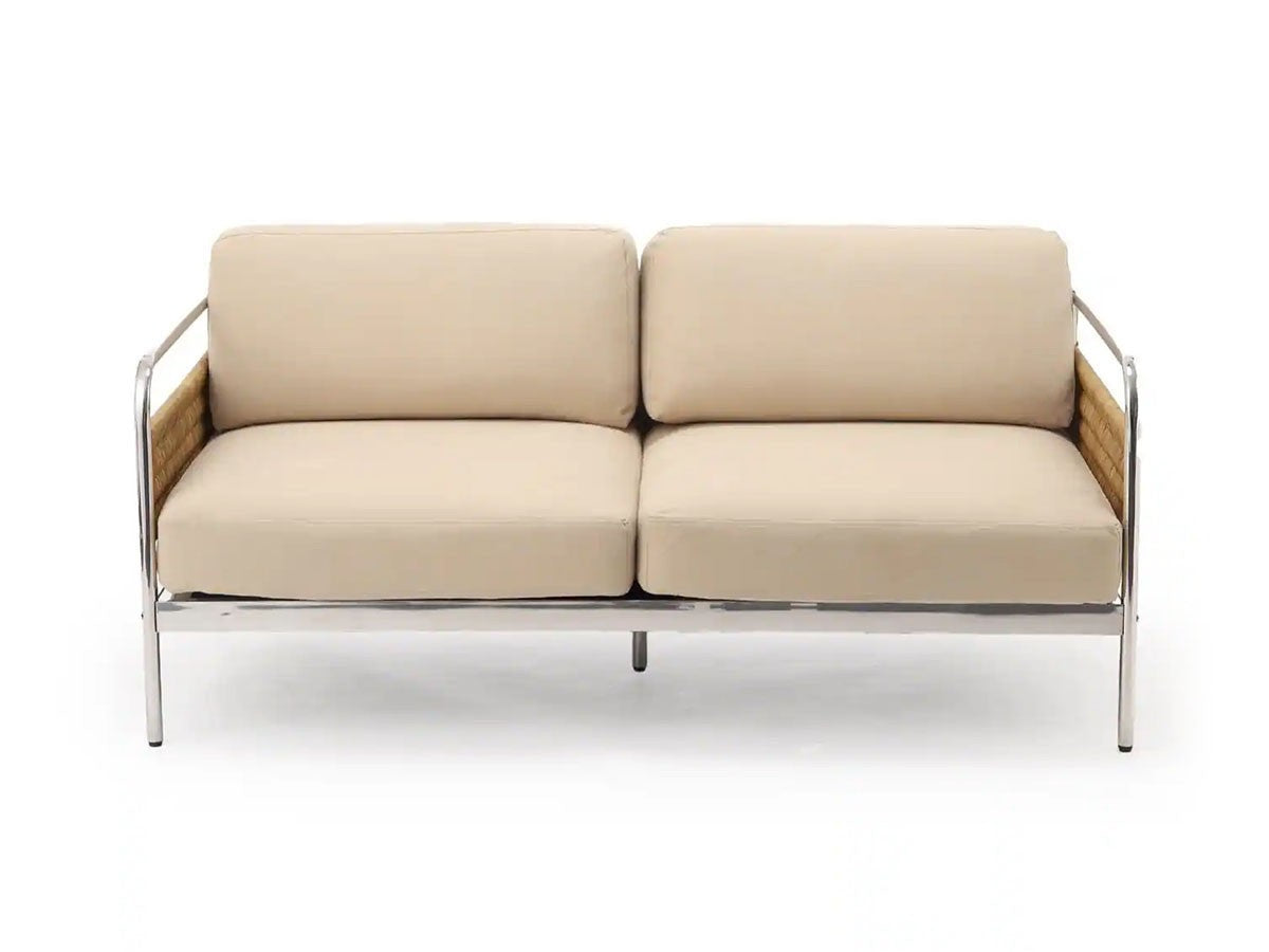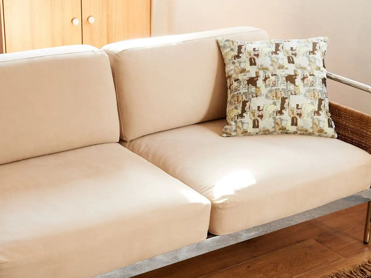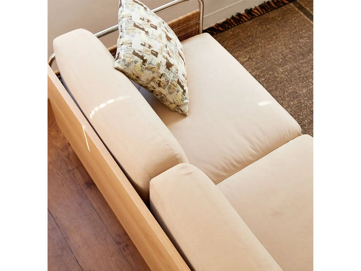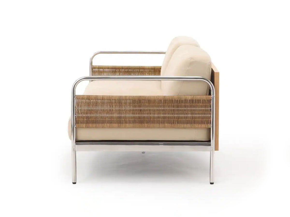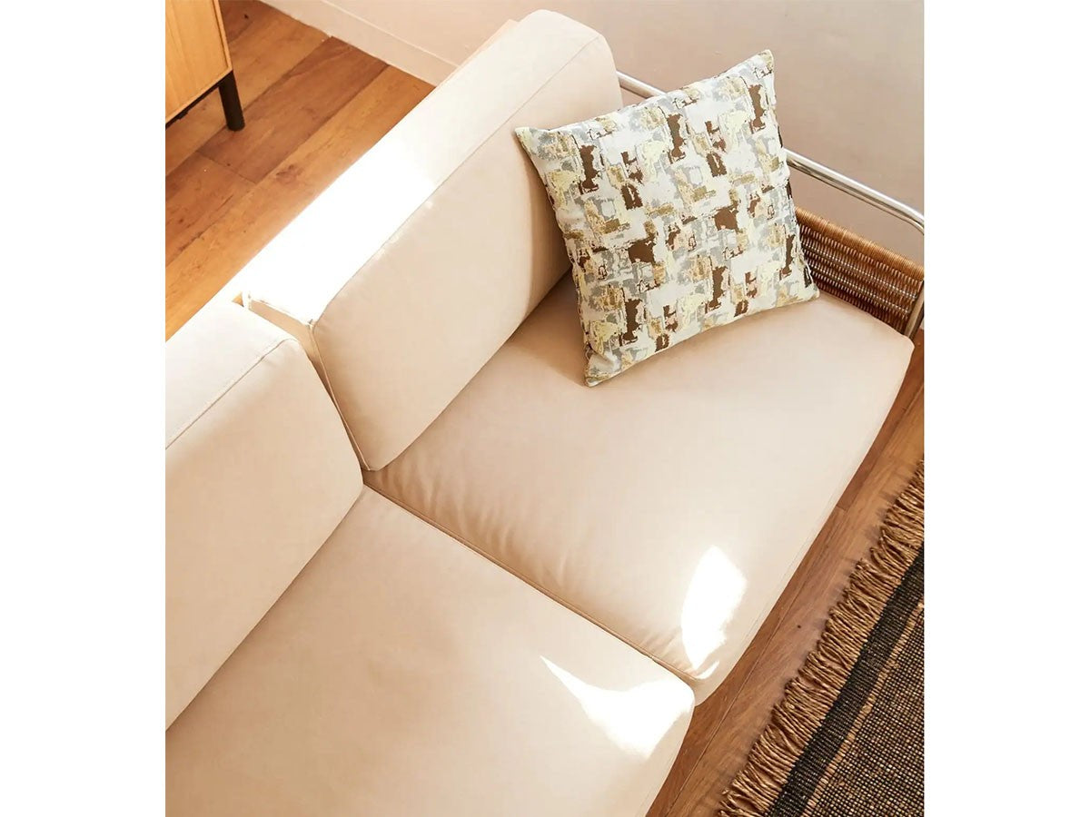 オランダのヴィンテージソファをベースとして、リデザインされた2人掛けソファ。フレームのステンレス、ラタン、木、スエード調の張地と、異素材をミックスすることで、パーツ毎に異なる質感を楽しめ、飽きのこないデザインとなっています。座面は硬めで、安定感のあるしっかりとした座り心地です。クッションは座と背ともにカバーリング仕様となっており、ドライクリーニングでお手入れが可能です。フレーム本体は組み立て式のため、搬入経路が狭い住宅にもおすすめです。
