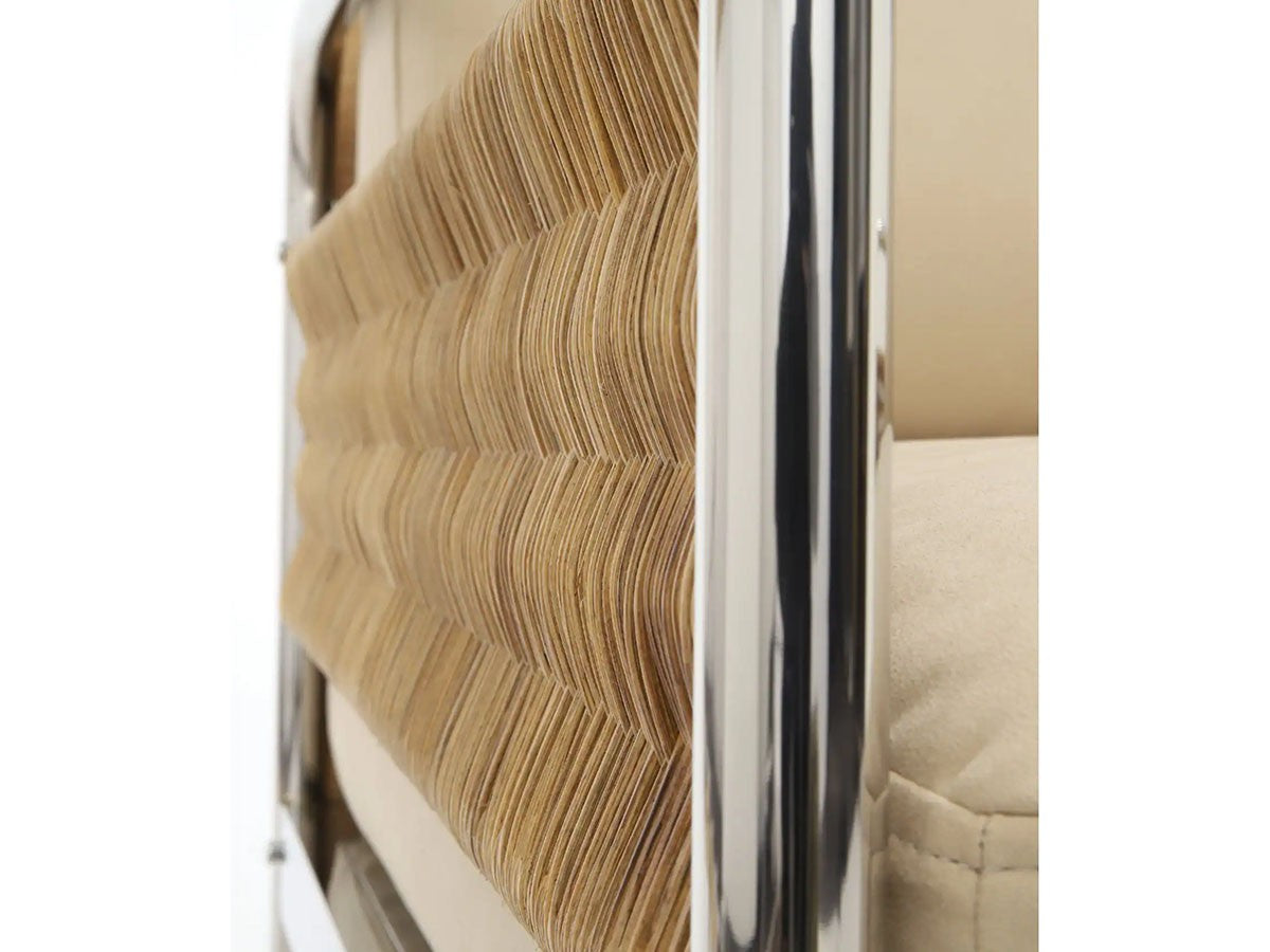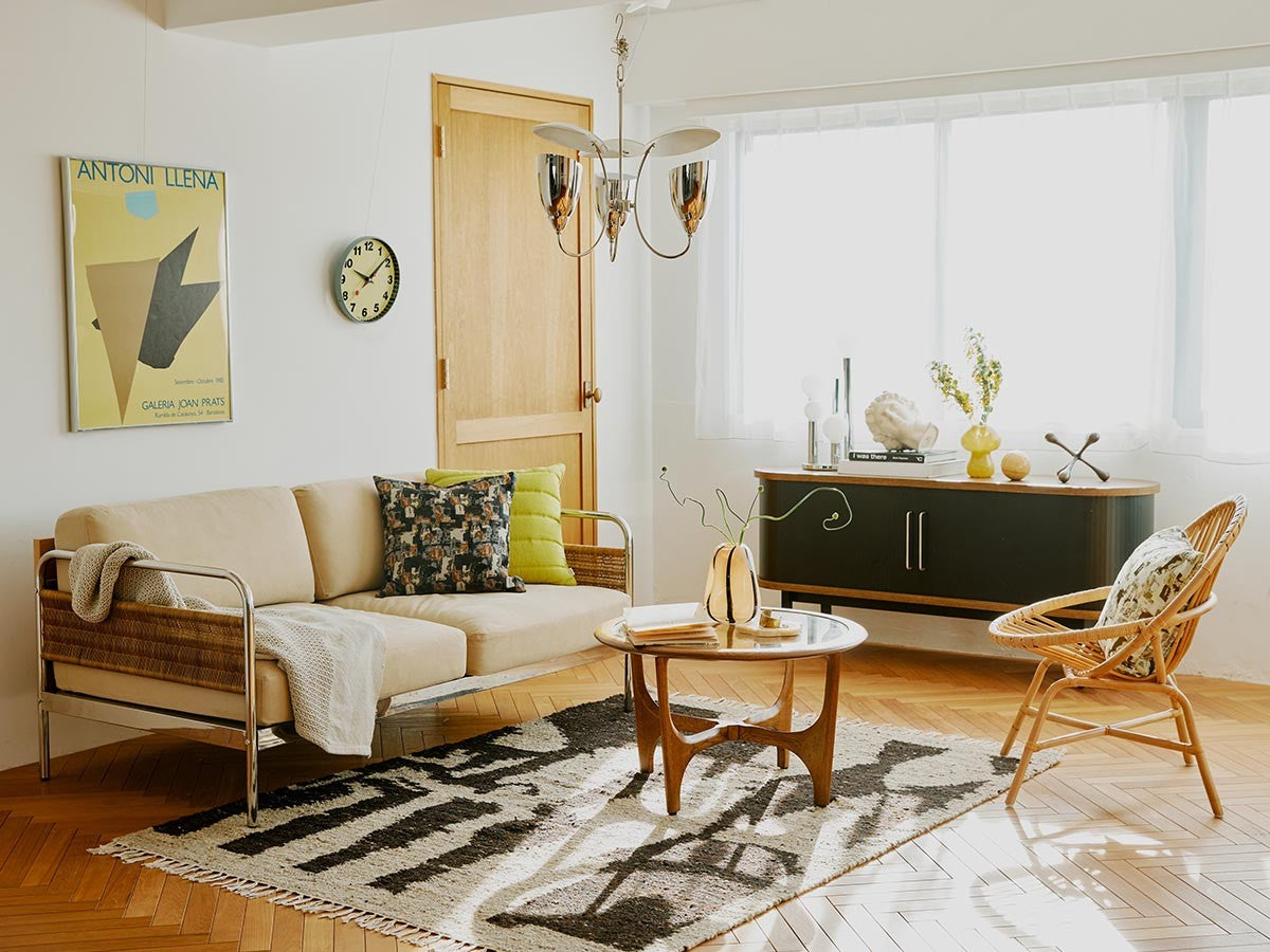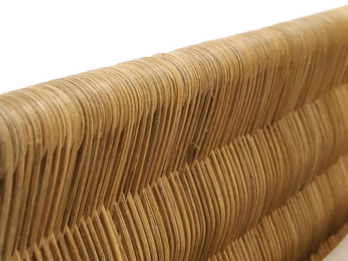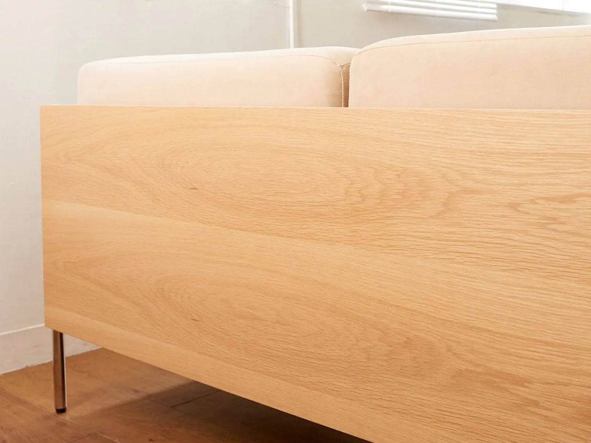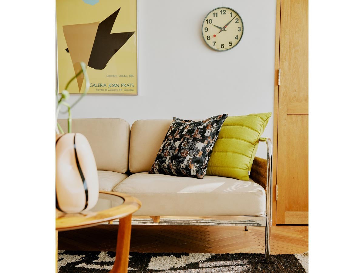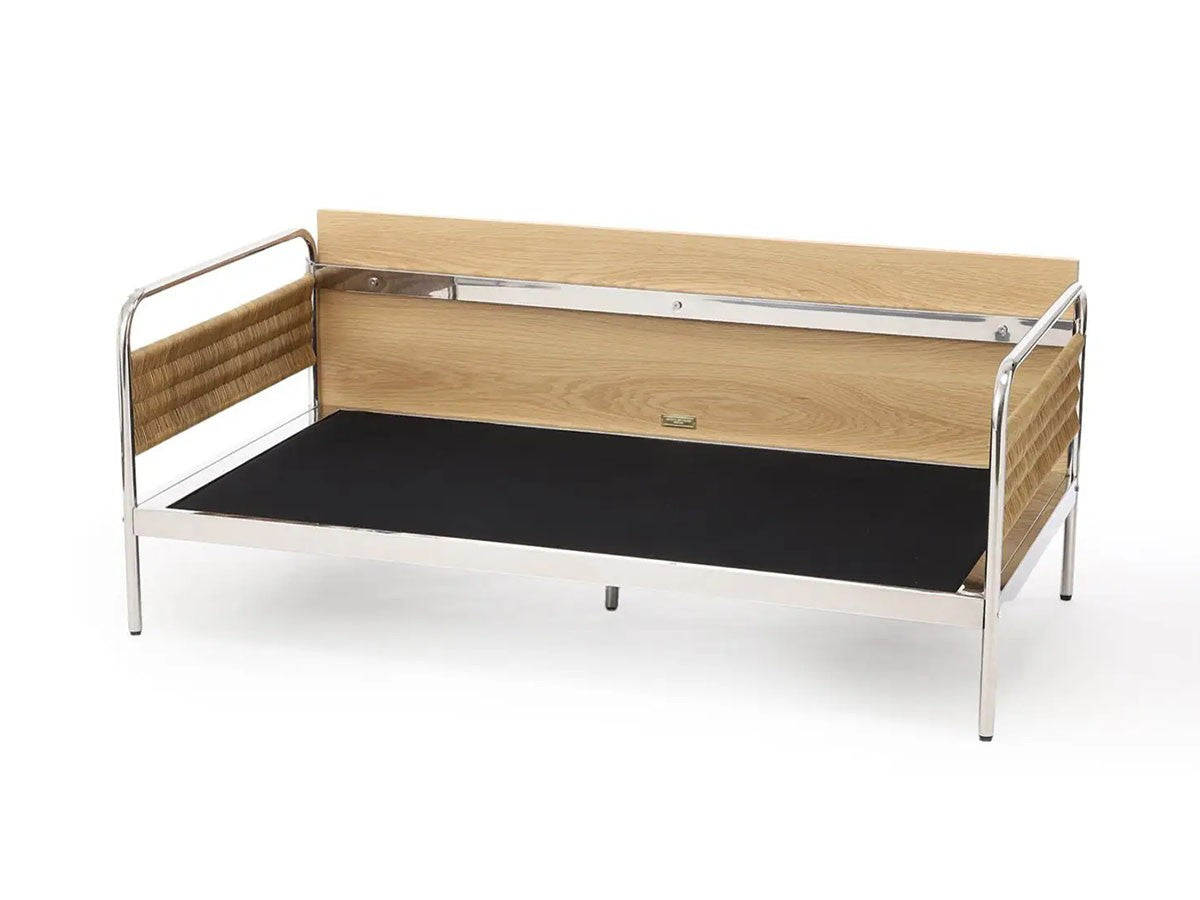 オランダのヴィンテージソファをベースとして、リデザインされた2人掛けソファ。フレームのステンレス、ラタン、木、スエード調の張地と、異素材をミックスすることで、パーツ毎に異なる質感を楽しめ、飽きのこないデザインとなっています。座面は硬めで、安定感のあるしっかりとした座り心地です。クッションは座と背ともにカバーリング仕様となっており、ドライクリーニングでお手入れが可能です。フレーム本体は組み立て式のため、搬入経路が狭い住宅にもおすすめです。